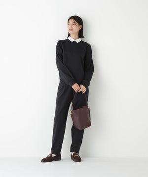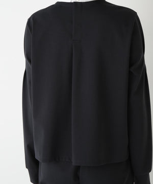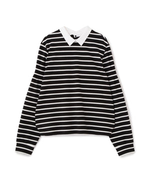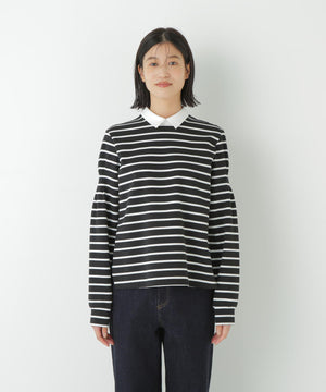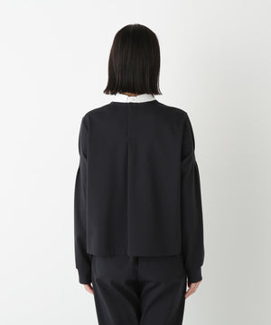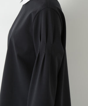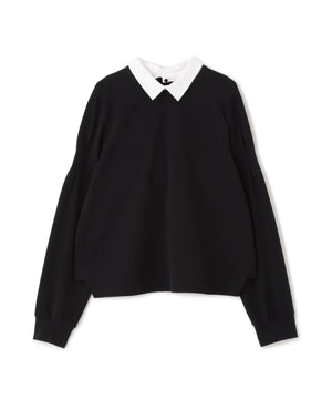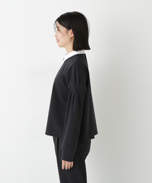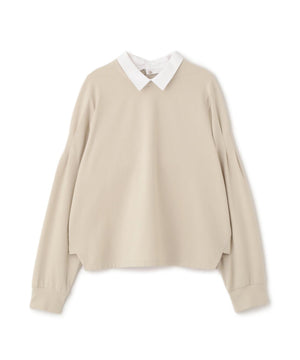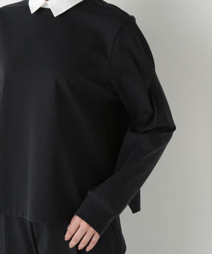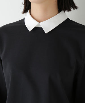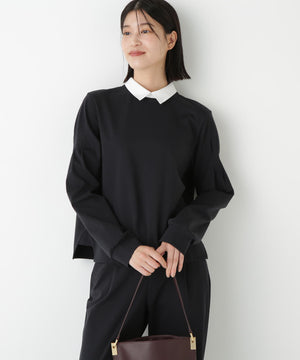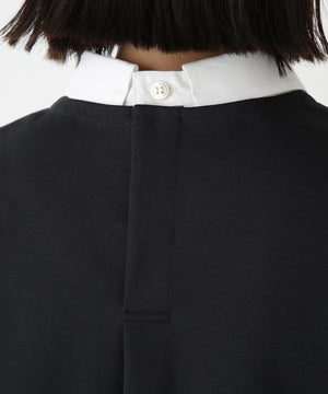 布帛シャツ衿をドッキングしたきれいめカットソープルオーバーです。衿は釦で取り外しが可能でクルーネックプルオーバーとしても着用できます。