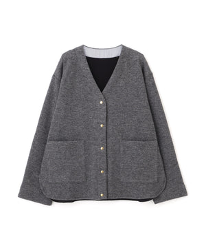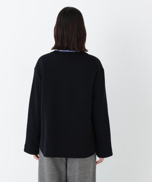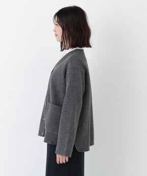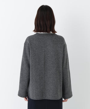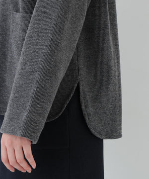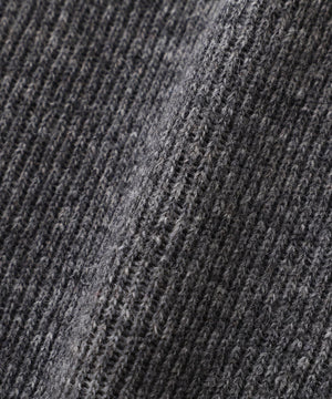 ローゲージとハイゲージを組み合わせて編み上げ、表には地柄が見え、裏はさらりとした表面感のウール混クォーターゲージを使用しております。