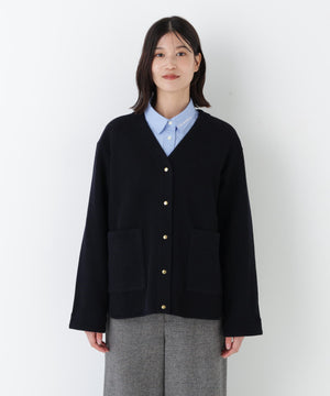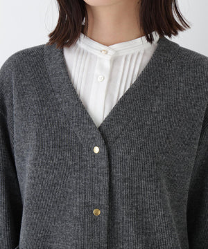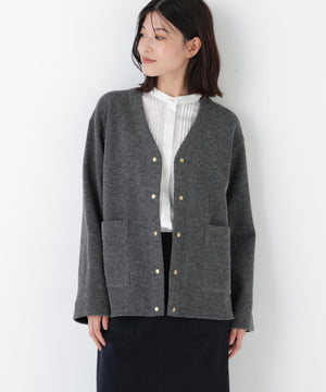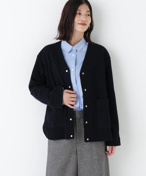 トラッドなV開きのアウターライクなニットソーカーディガンです。小さめゴールドドット釦使いがポイントです。