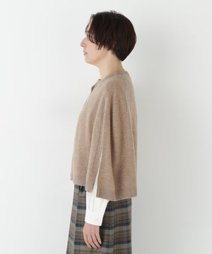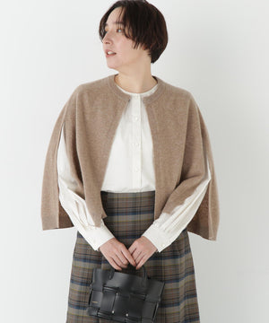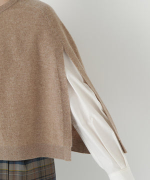 ポンチョ型のカーディガンです。 脇側のスリットから腕の出し入れが可能です。ベストに変わる新しいレイヤードアイテムです。