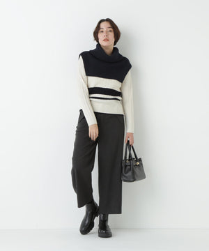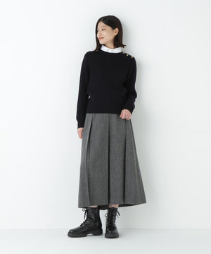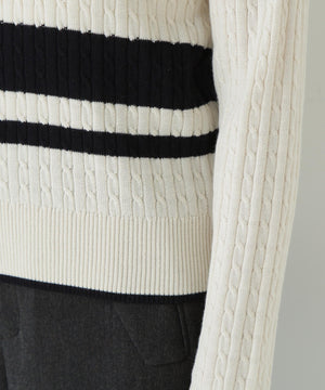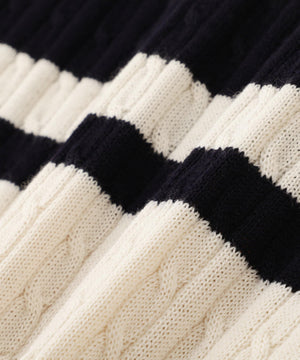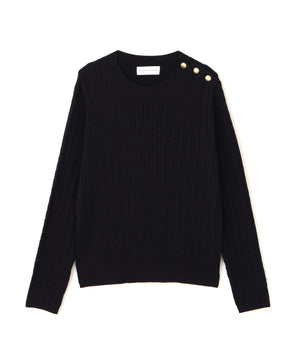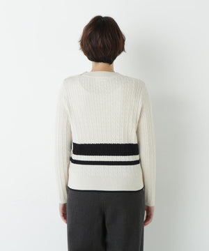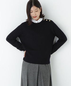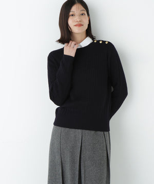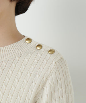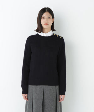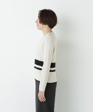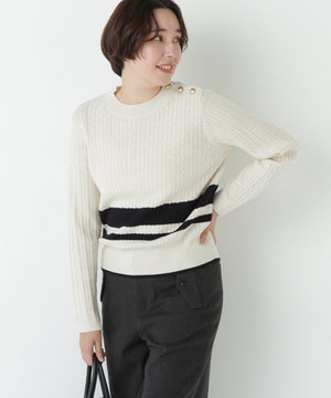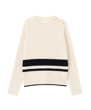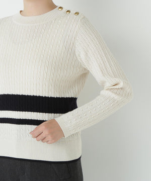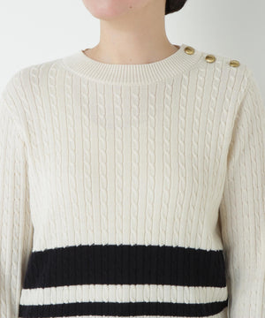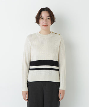 細めのケーブル柄編みと、肩の金ボタンがトラッドらしく気分が上がる1枚です。白にはネイビーラインが入り冬マリンなスタイリングが決まるデザインです。