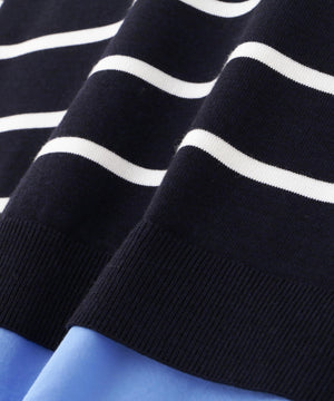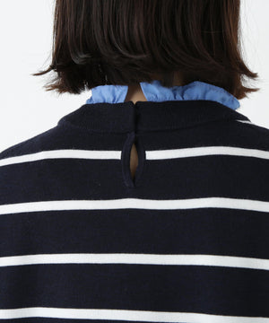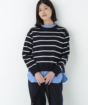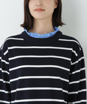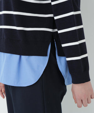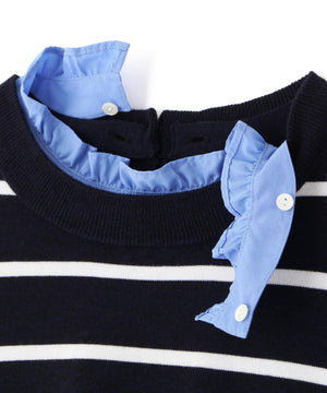 フリル襟ブラウスを重ね着したようなデザインの布帛ドッキングニットです。襟元と裾からのぞく布帛が価値観のあるデザイン。襟は取り外し可能なので、シーンに合わせて印象を変えていただけます。