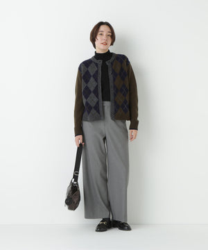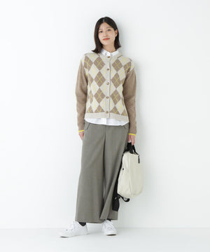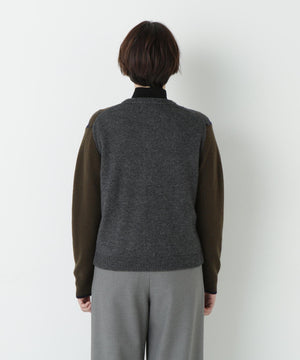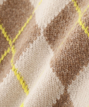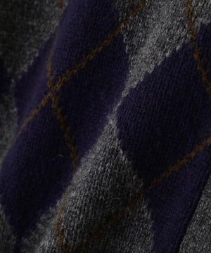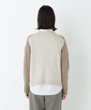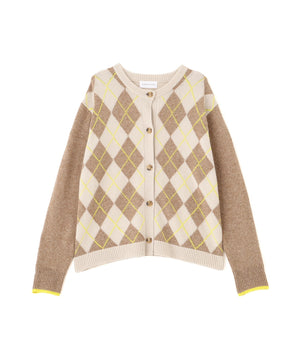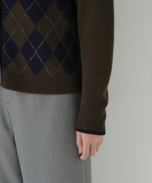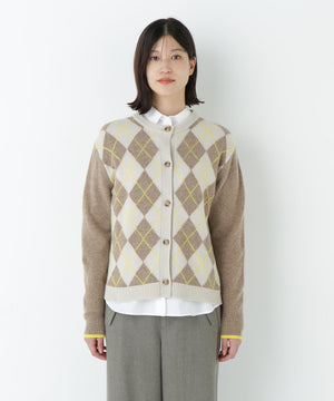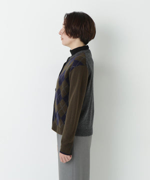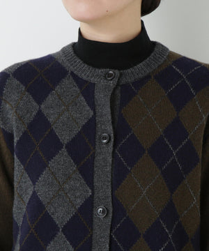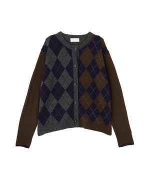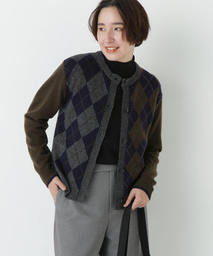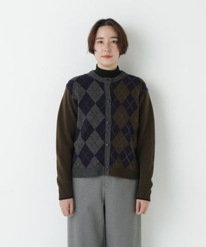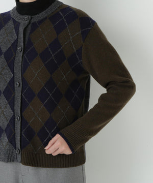 前身頃がアーガイル柄、後身頃と袖が天竺のバイカラー使いで柄と色で楽しめるクルーネックのカーディガンです。
