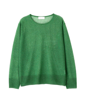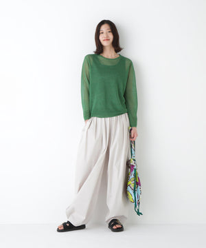 清涼感のあるラメ素材で編みたてたベーシックなクルーネックプルオーバー。ベーシックなサイズ感でコーディネートの幅が広がります。