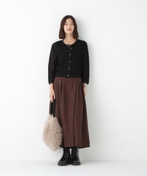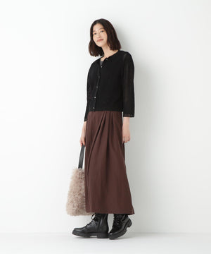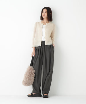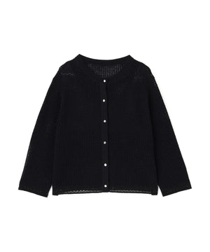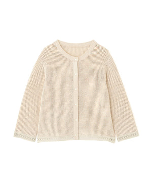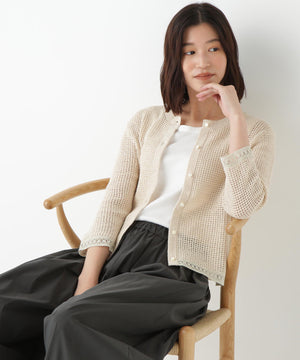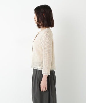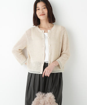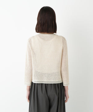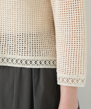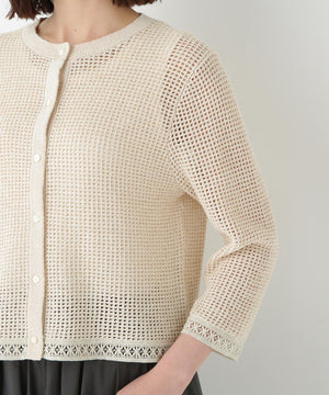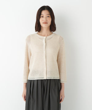 ストレートヤーンとブークレヤーンを引きそろえてメッシュに編みたてたクルーネックカーディガンです。ハイゲージながらも凹凸感があります。袖口と裾は綿のレースをたたいて軽く仕上げました。