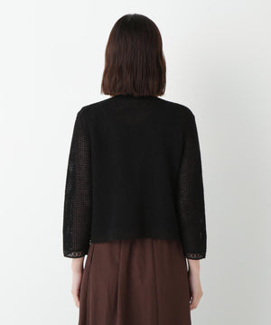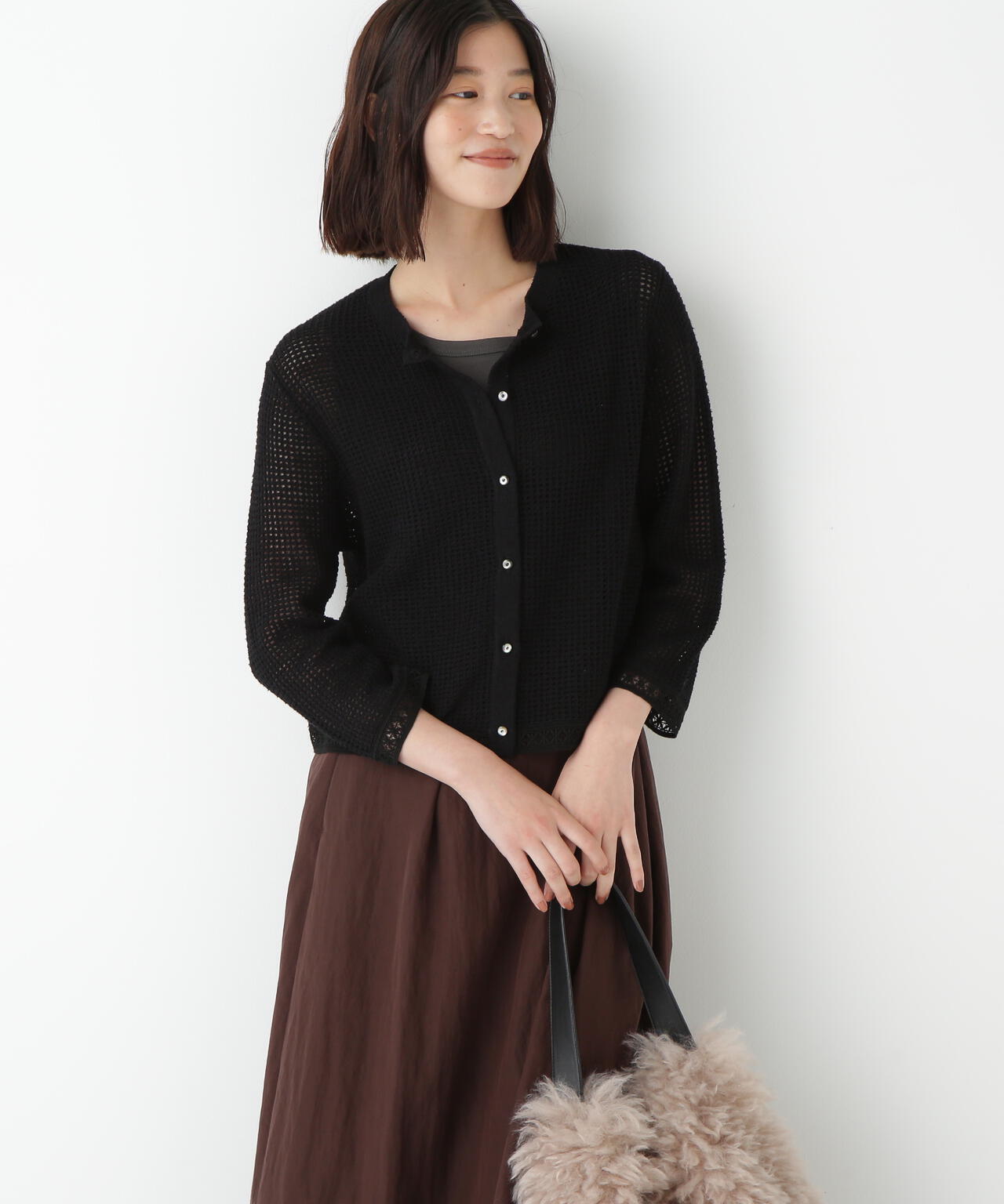 ショート丈のデザインでボレロの様に羽織っていただけるカーディガンです。薄手のカットソーとレイヤードしていただくことでメッシュの凹凸感がアクセントになります。