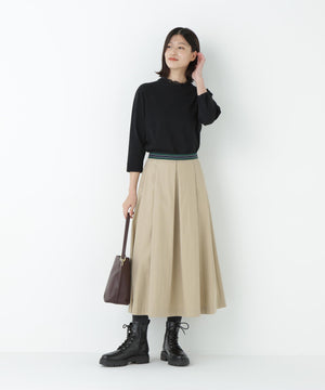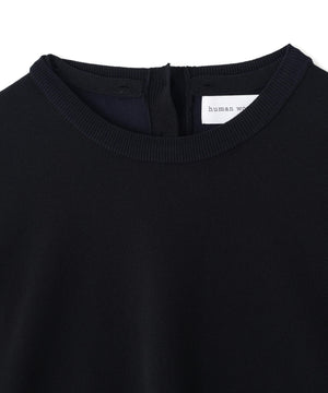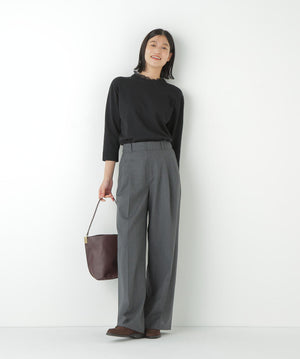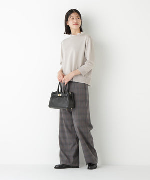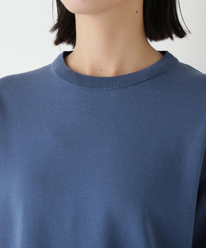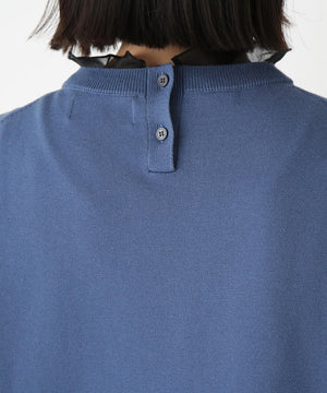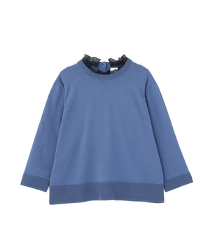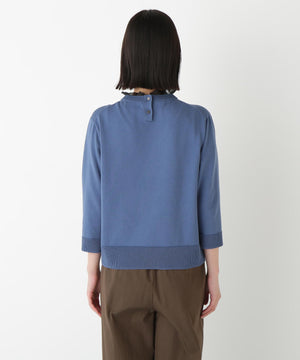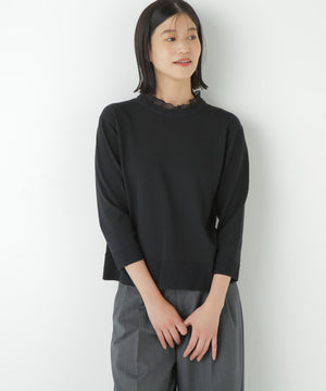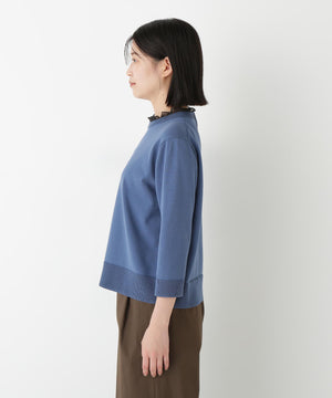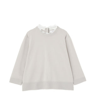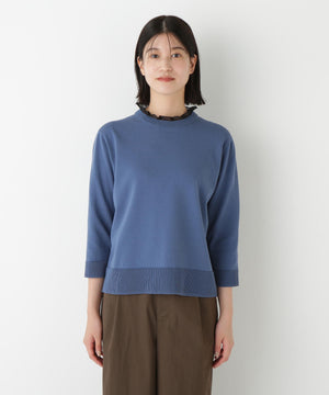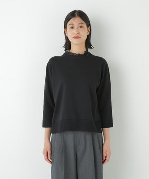 14Gプレーティング天竺のクルーネックプルオーバー。衿に取り外し可能のフリル衿付きです。7分袖でストレートな袖口は締め付け感が無く、暑さの残る季節でも着やすいデザインです。