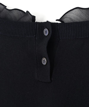 ニットはドライタッチでクールな印象です。フリル衿はシアーな素材感が品があって涼しげな印象です。