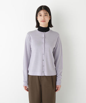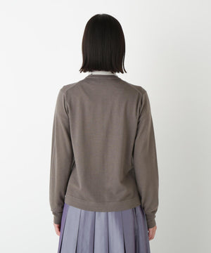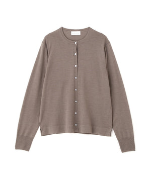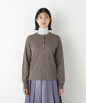 ベーシックなクルーネックカーディガンです。目面のきれいな素材なので上品でオンオフ問わず活躍します。