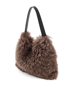 手や肩に持ち手を掛けると天口中央部分がへこみニュアンスあるシルエットの出るスクエアフェイクファーバッグです。