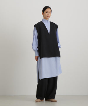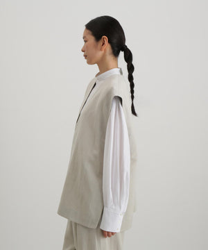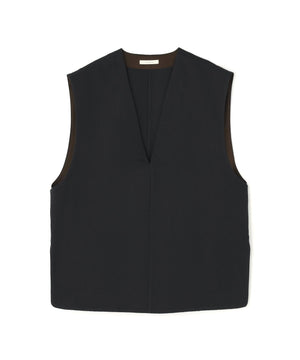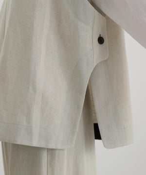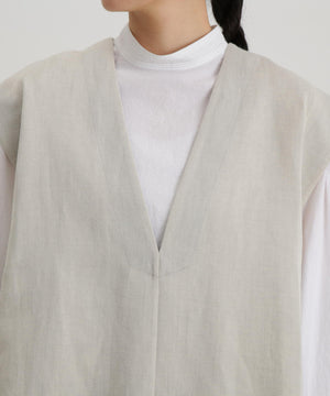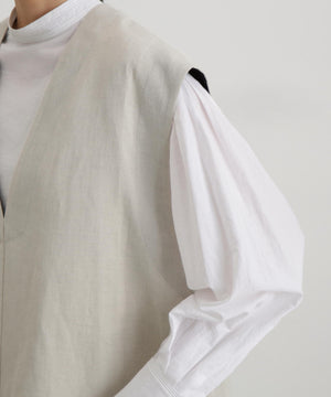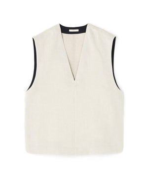 大人の表情をもつウール麻の素材のVネックベスト。Vネックのラインは広がりすぎず、中に着る衿ぐりとも相性が良いこだわりのサイズ。サイドはタブとボタン開きがデザインアクセントにもなり着脱もしやすくなります。内側の配色の見返しの布もアクセントになります。