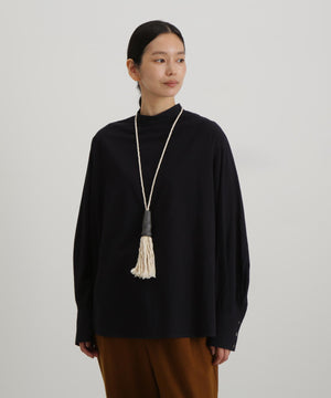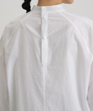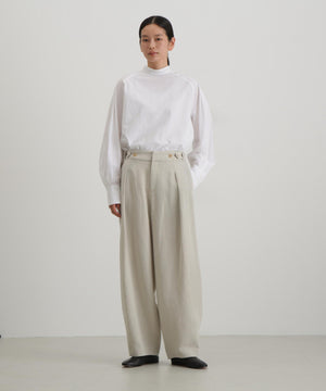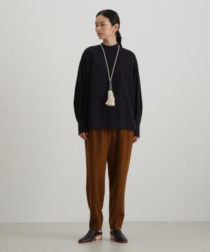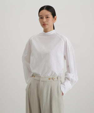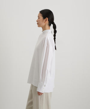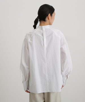ベストとの重ね着にも1枚で着ても様になるブラウス。ニットの衿ぐりからチラリと見える小さめのスタンドカラーやベストを着た時に邪魔にならないシンプルな見頃。袖にはベストとのバランスを考えボリュームのあるデザインに。袖口は端のボタンを外して折り返すと袖丈の調節にもなります1枚で着ても肩に施したタックがアクセントになります。