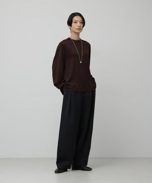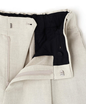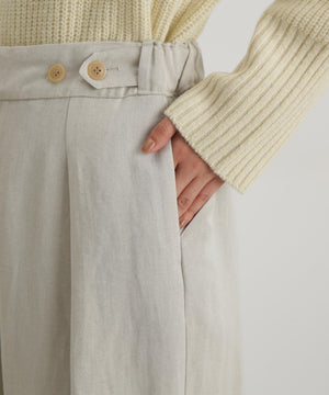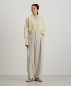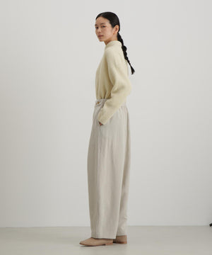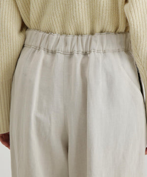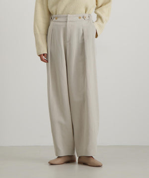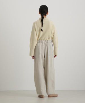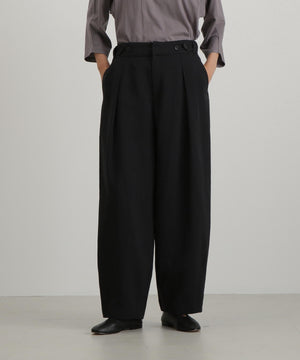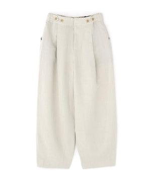 ウール麻の素材が大人の表情をもつバレルシルエットのパンツ。wagonaのパンツの特徴ある後ろポケット付き。サイドのタブとボタンは後ろのゴム部分から引っ張ることでサイズの調節が可能。ヒップやもも周りはゆとりを持たせ裾にダーツを取り裾に丸みを持たせたシルエット。