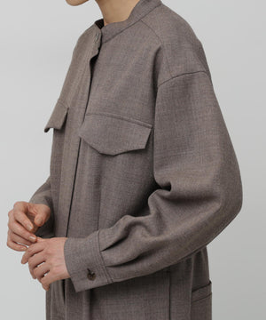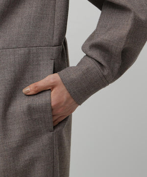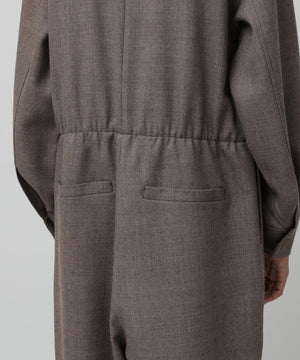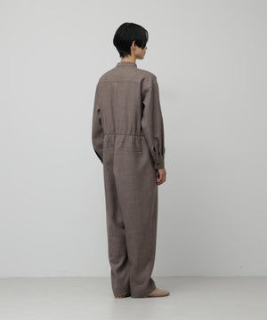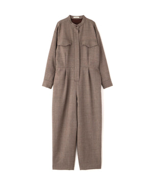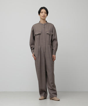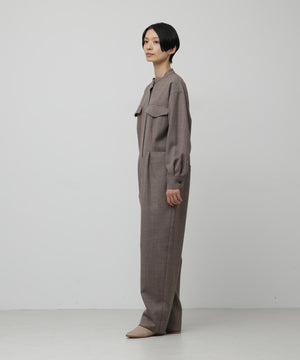 スタイリストの轟木節子さん×wagonaコラボのウール素材のオールインワン。色はブラウンの1色展開。ドライタッチなウール素材を使用し胸のフラップポケットはマニッシュな印象に。スタンドカラーで大人の顔を持たせています。