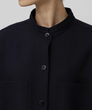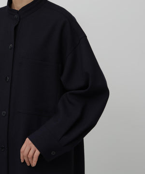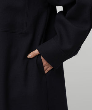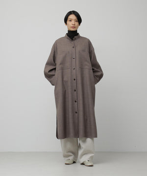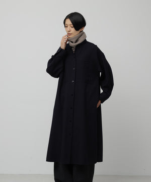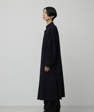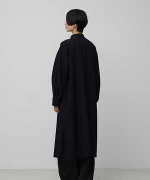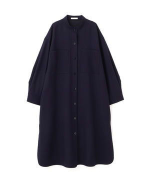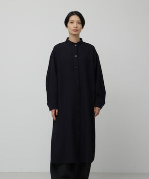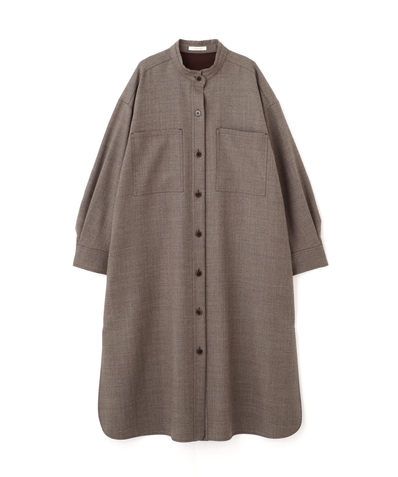 スタイリストの轟木節子さんとwagonaのコラボで作られたウール素材のワンピース。仕事着のような大きなポケットのシャツワンピース。衿には変形のバンドカラーで大人の印象に。サイドのスリットは大きく開けパンツと重ねた時のバランスを大切に作りました。