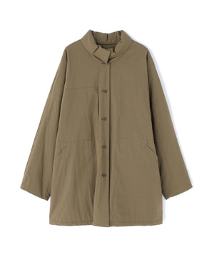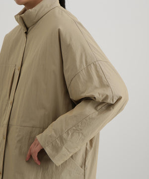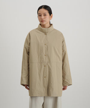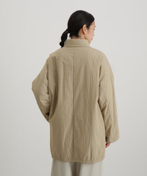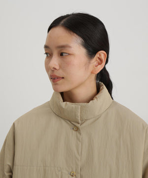 オーバーサイズのシャツを着るような中綿入りのブルゾン。前中心や袖口には中綿を入れず薄く軽い仕立てにすることでスッキリとした印象にし、春まで長く着ていただけます。顔周りはスタンドカラーに中綿を入れ柔らかい印象に、丸みのある袖口は折り返して長さの調節していただけます。