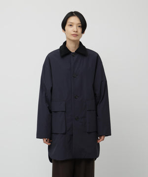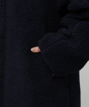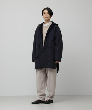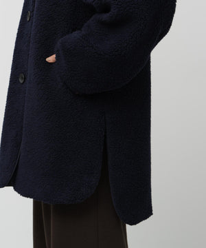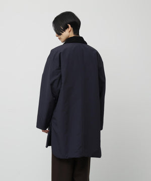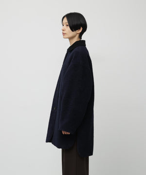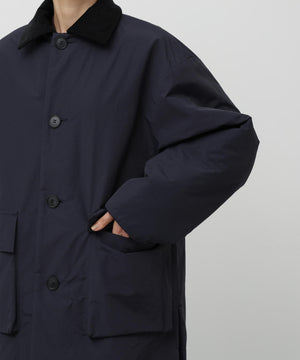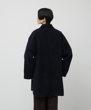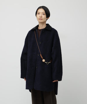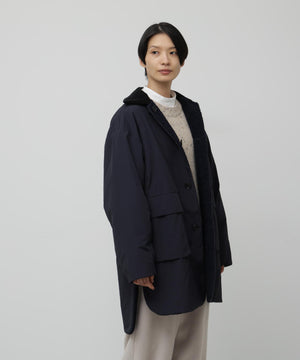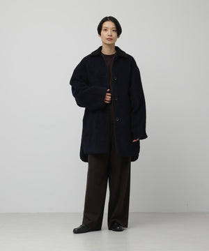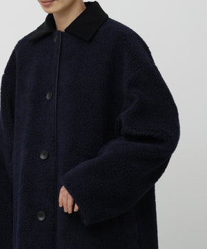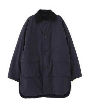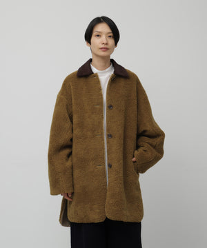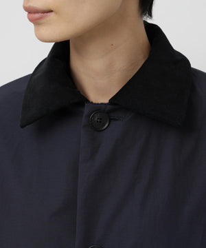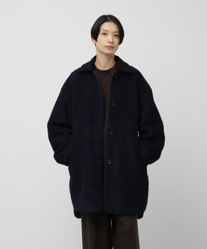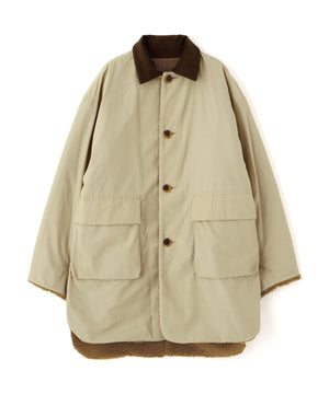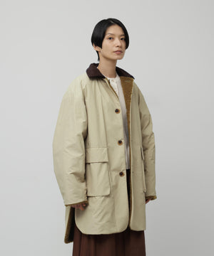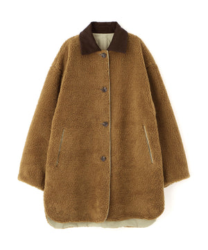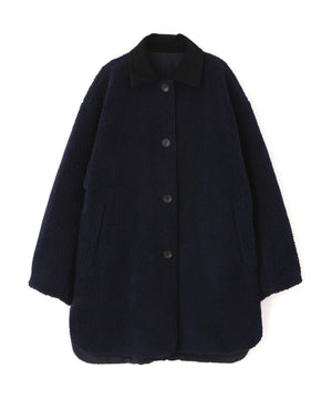 ボア素材とナイロン素材の両面リバーシブルで着用できるコートです。綿ナイロン素材を表にした時はシンプルなステンカラーで温かみのある着用感。プードルボアの素材を表にして素材感を楽しむコートにもなります
