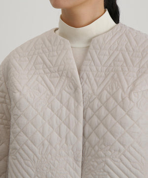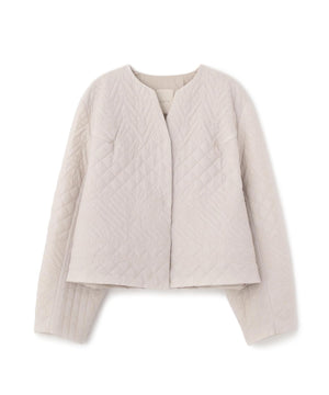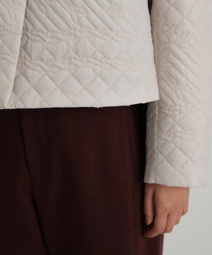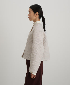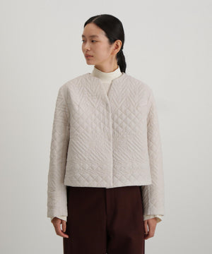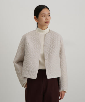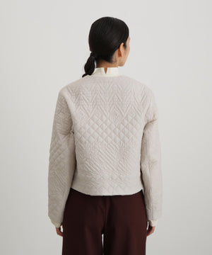 刺繍の陰影が美しい、キルティングが特徴の中綿入りのジャケット。キルティングのステッチは幸運を運ぶヤドリギを隠しモチーフにしたオリジナルのデザイン。前の止めは表に出ないようシルクスナップを使用しデザインはシンプルに。携帯電話が入るサイズのポケットを内側に忍ばせています。