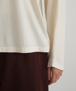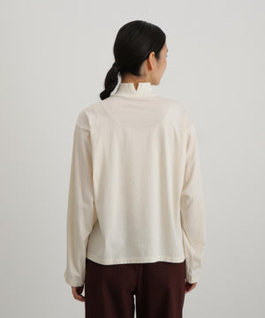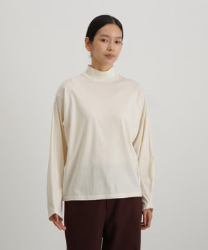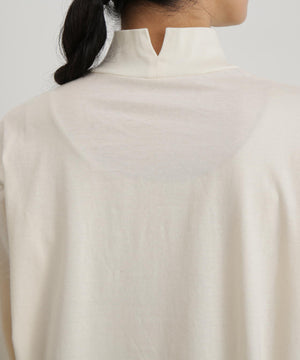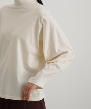 ゆったりとしたハイネックの長袖Tシャツは袖が緩やかに上向きのバンザイをしているようなユニークなデザイン。腕の上げ下げが楽に感じ、腕を下ろしているときは綺麗に収まるwagonaオリジナルのパターンでお作りしています。ハイネックはフライス編みの素材を使用し伸縮性があるので楽に着脱できます。丸みのある袖は1枚でも顔になるデザイン。