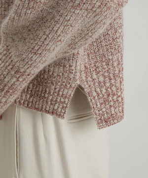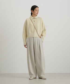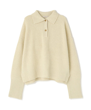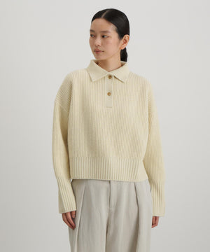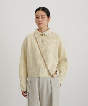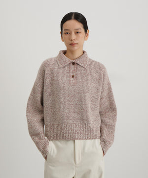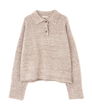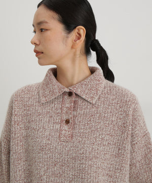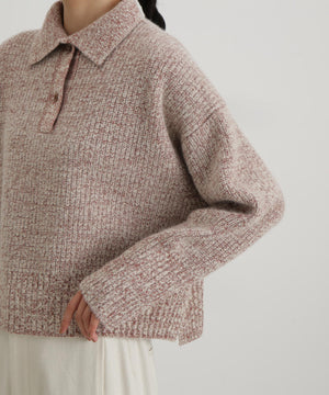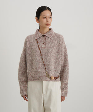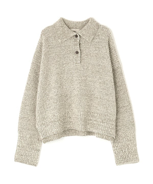 温かみのある糸で編まれたポロ衿のニット。ウール×フォックスの生成りの糸にシルクの配色カラーを混ぜ奥行きのある表情にしています。短めな着丈にし鮮度あるバランスで作りました。