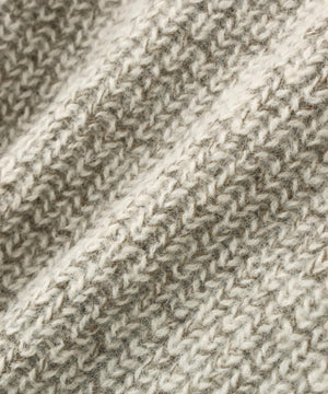 毛の吹いたウールフォックスの生成りの糸とマットな質感のノイルシルクの配色糸を使用した5Gの方畦編みニット。温かみのある他にはない表情のニットです。前立ての総針編みのパーツは編みの特徴で柄のクセが出る場合があります。
