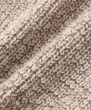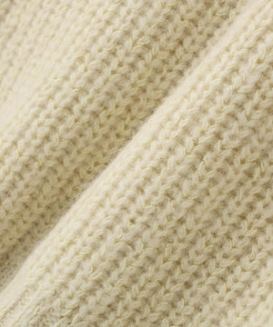 毛の吹いたウールフォックスの生成りの糸とマットな質感のノイルシルクの配色糸を使用した5Gの方畦編みニット。温かみのある他にはない表情のニットです。