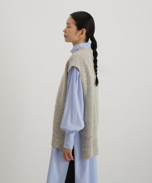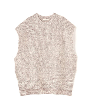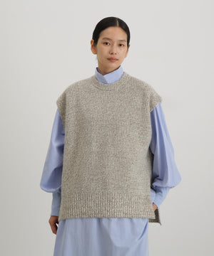 温かみのある糸で編まれたアゼ編みのベスト。ウール×フォックスの生成りの糸にシルクの配色カラーを混ぜ奥行きのある表情にしています。シンプルなデザインのベストは気温調節の難しい季節にちょうど良く着ていただけます。アームホールを大きく開け下に着るものを選ばないようなサイズにしています。