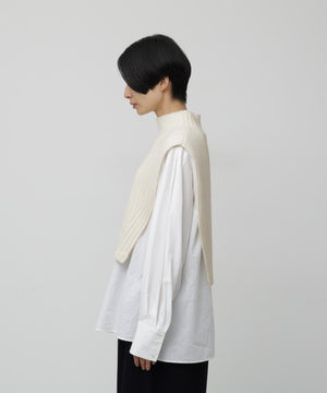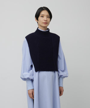 ヘリンホン柄の凹凸のはっきりとした編みをデザインのアクセントにしたベスト。サイドのリブ柄は流れの楽しさのある編み。裾の幅が狭くなるようなシルエットにすることで見頃がスッキリとして見える効果もあります。後の着丈も少し長めに作ることで着用した時の姿がきれいに見えるバランスにしています。