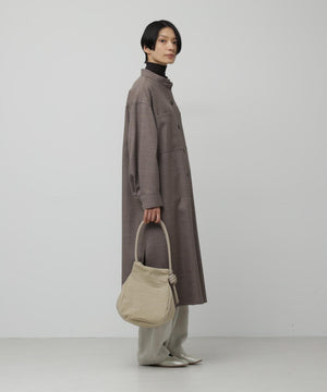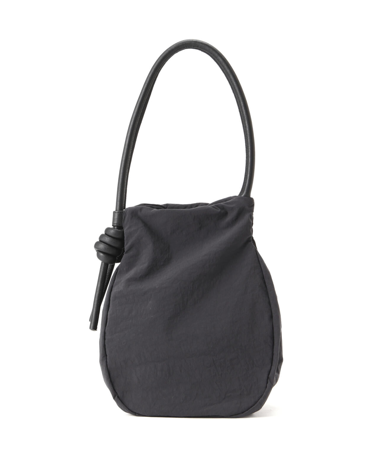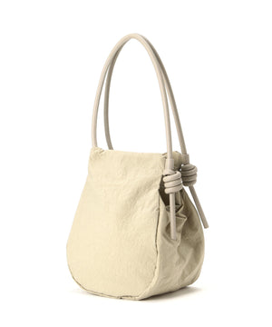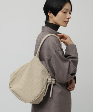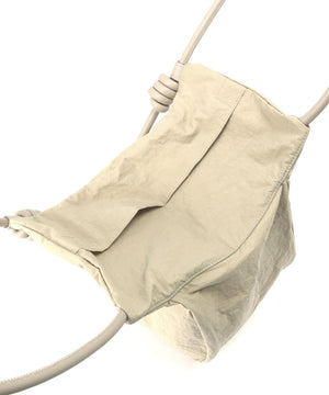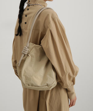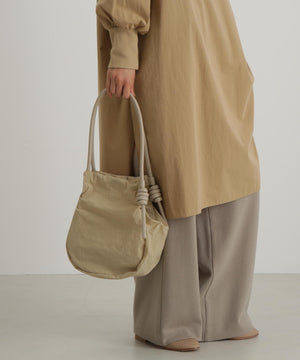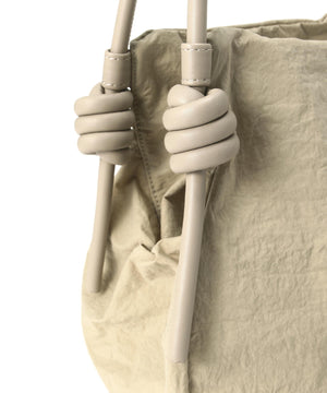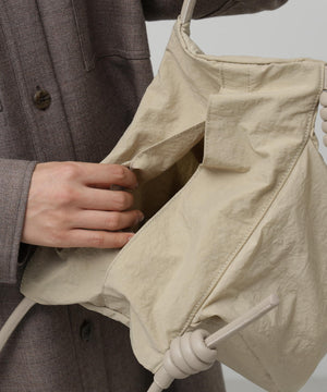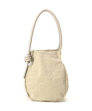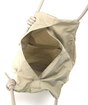 wagonaオリジナルのナイロンバッグ。肩ひもから続いた結び目は螺旋をイメージした結び目が特徴。マチを大きくとりマチを広げた時と折りたたまれた時のフォルムの変化を楽しんでいただけます。マチが深いので見た目より物が入り、内側の表と裏に内ポケットがあるので小物の収納にも便利です。上ふたをつけて中がまる見えにならない仕様にしています。