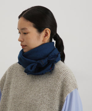 インドで生産されたカシミヤウール素材でハンドメイドの暖かみを残した仕上がり。スクエアーデザインで薄手の生地ながらコートやニットとの相性がよく長い季節活躍してくれるアイテムです。さらりと気持ちの良い肌触りの生地で、チクチクすることなく首まわりを優しく包み込んで込んでくれます。