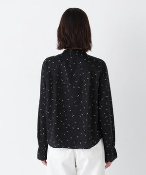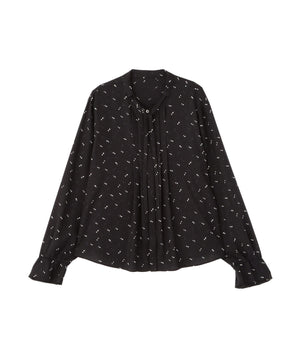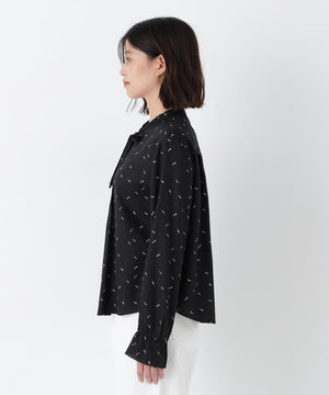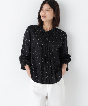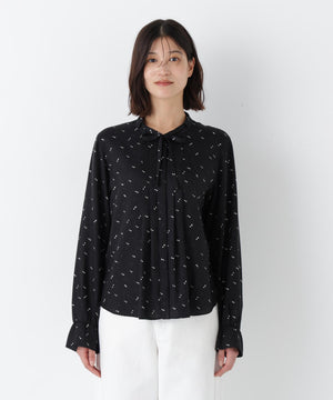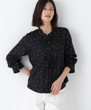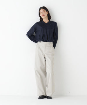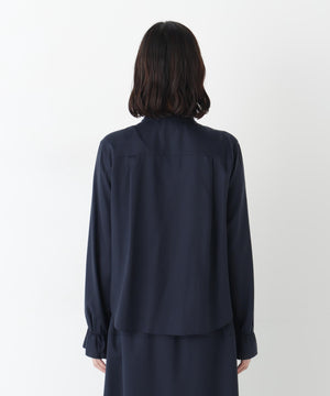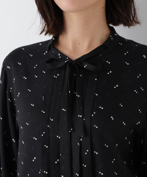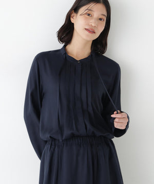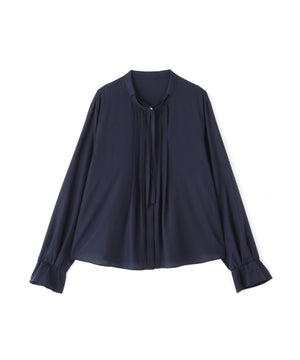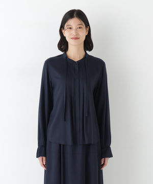 細めのリボンタイとフロントタックが上品なブラウスです。袖口にはピコミシンを使用し軽く仕上げています。