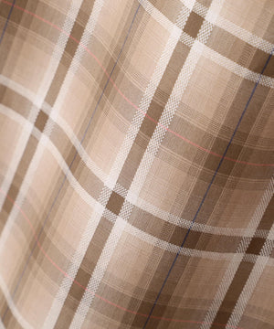 コットンのオリジナル先染めドビーチェックの素材を使用。ドビー部分に麻をいれてニュアンスを出しています。ベージュはオンブレーチェック、ネイビーはドビーの部分のみを黒で配色した無地見えの色目です。