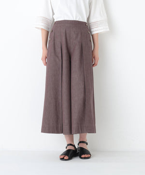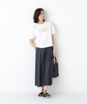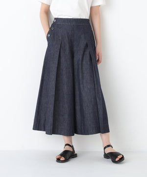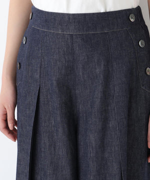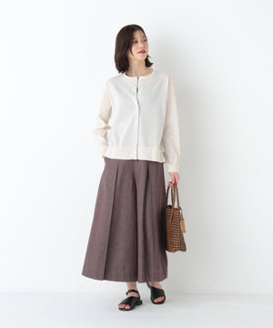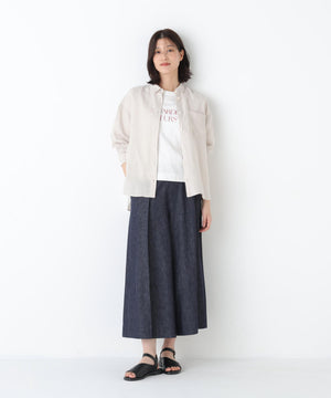 ボタンとタックステッチがポイントになるので、トップスはシンプルデザインのものが好相性です。同素材のブラウスとのセットアップもおすすめです。