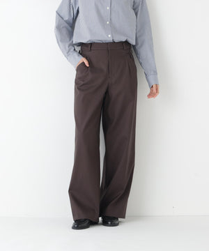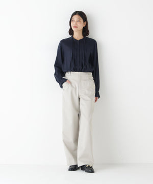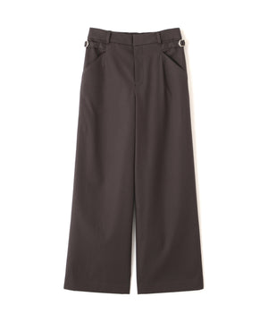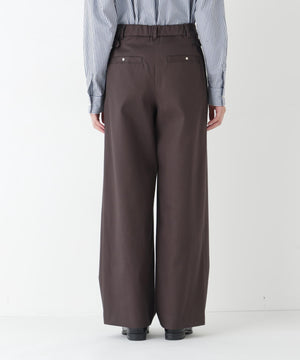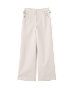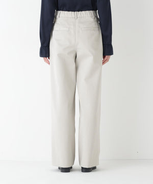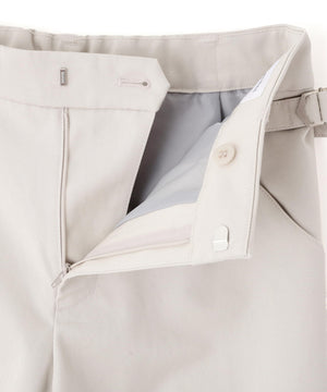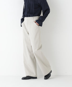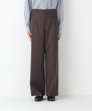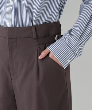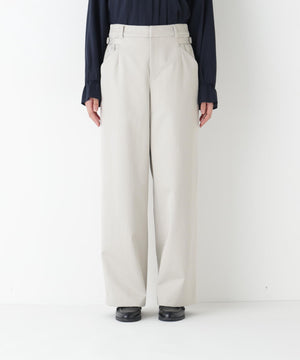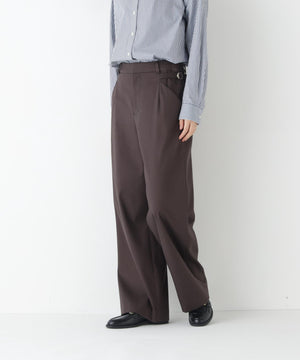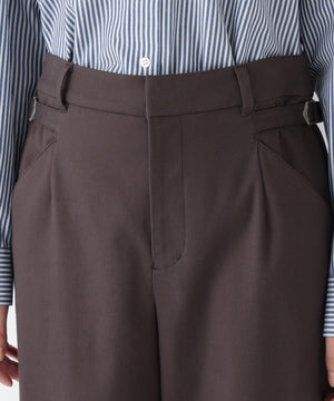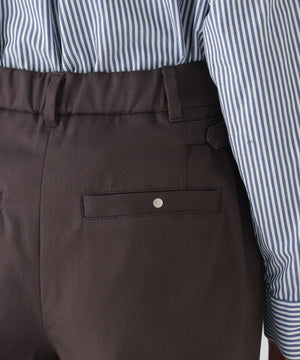 ウエストダーツに挟みこんだ送り付きアジャストミニベルトと、後ろポケットのドット釦使いがポイントのきれいめノータックセミワイドパンツです。