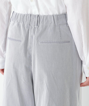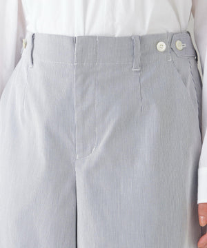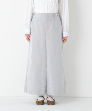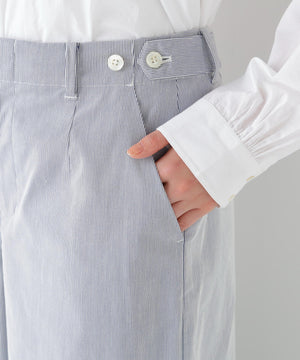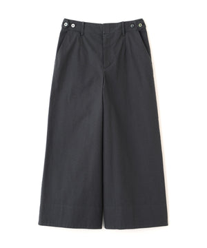 ウエスト周りをすっきりとした続きベルトで仕上げたガウチョパンツです。サイズアジャストできる夏らしい貝釦使いの平ゴム付き脇タブベルトもポイントです。