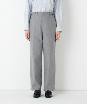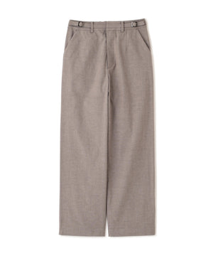 すっきりとしたストレートシルエットのパンツです。ベルトに細ミニベルトディテールを飾りにしたデザイン。後ろウェストはゴム仕様で仕上げてあります。