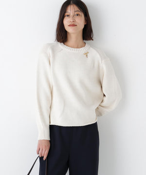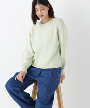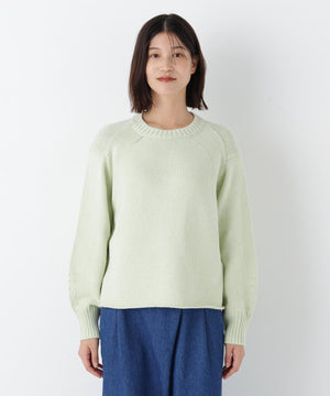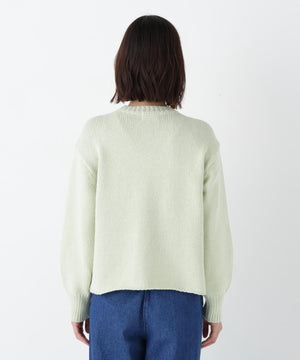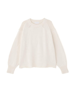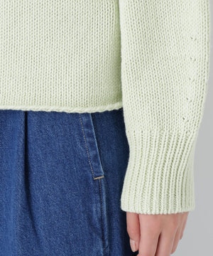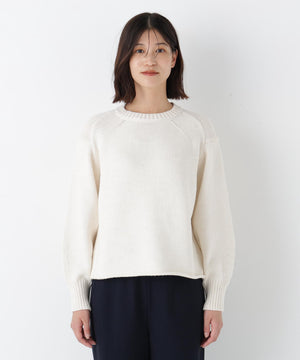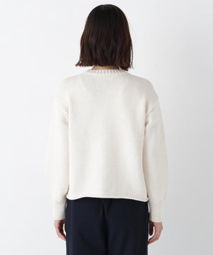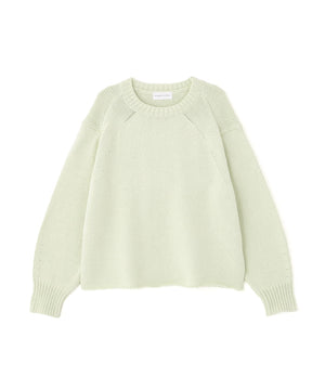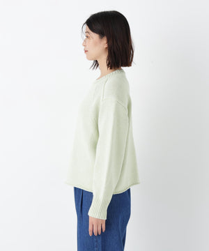 ローゲージのボリューム感が柔らかい風合いのクルーネックプルオーバーです。幅広の目立てをポイントにしたニットらしいテクニック使いが特徴です。裾はリブを使わず軽く仕上げました。