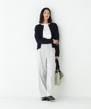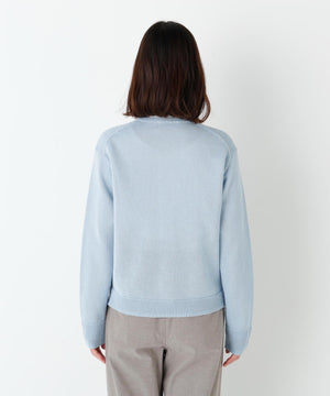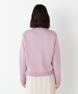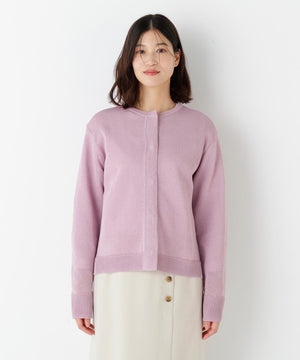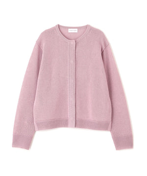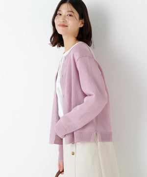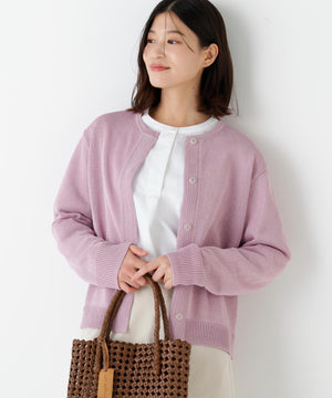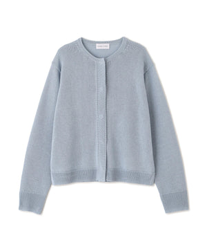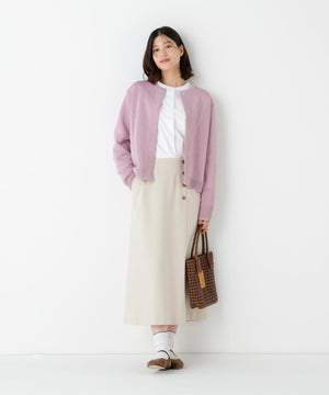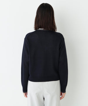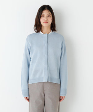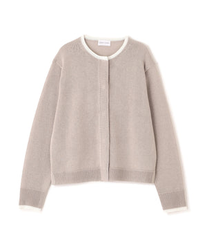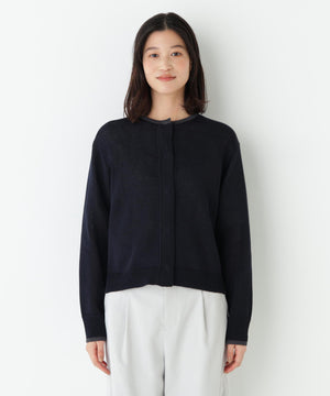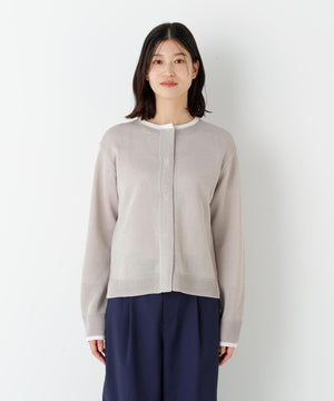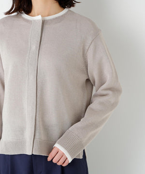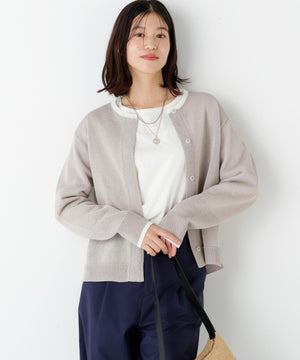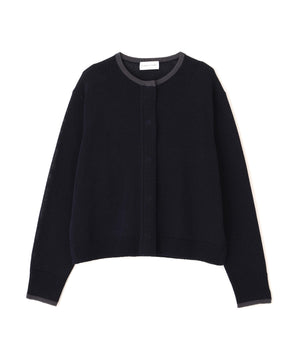 前立てにタック編みを入れたスナップ開きのクルーネックカーディガンです。カラーによって襟ぐりと袖口が配色になっています。