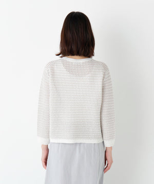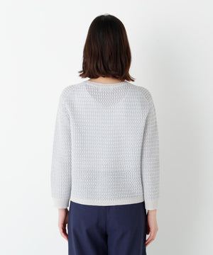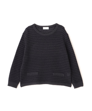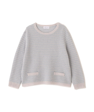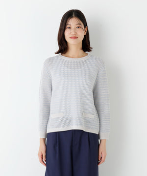 配色で地柄があり凸凹感がある7分袖のクルーネックプルオーバーです。飾りポケットのディテールもアクセントになっています。大きすぎないサイズ感なのでいろいろなシーンで活躍します。