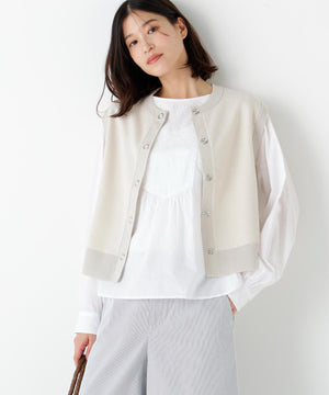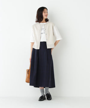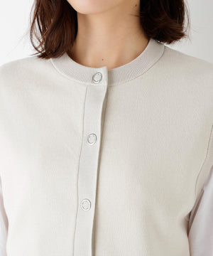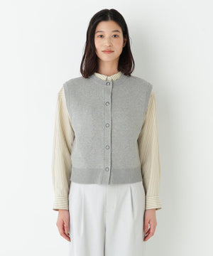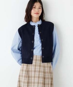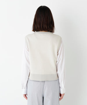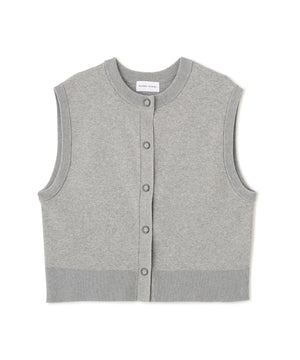 ジャカードで編立てた薄手ながらハリのある肉感が特徴のクルーネック前開きベストです。コンパクトなサイズ感で今季のトレンドを踏まえたシルエットです。前立ての大きめスナップドットがポイントです。
