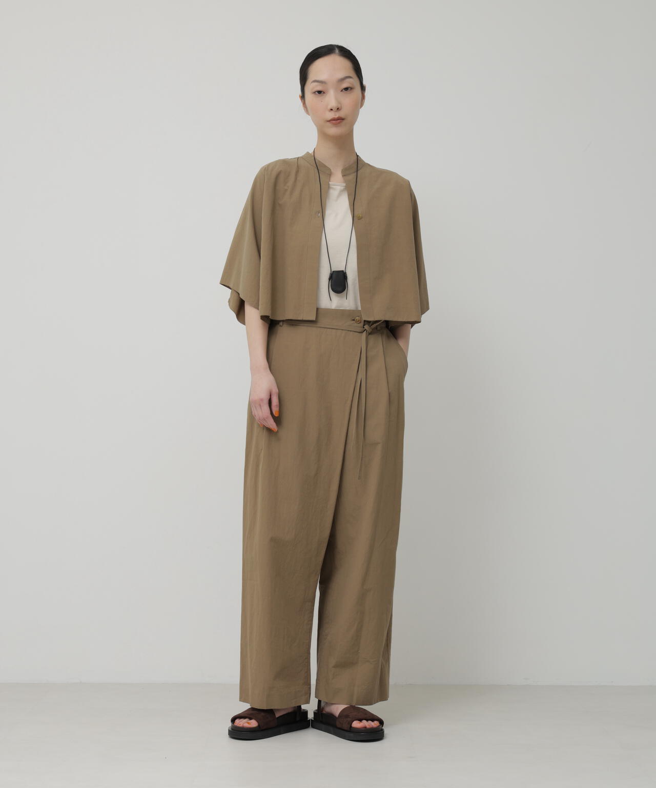 フロントに重なるように仕立てたデザインが、静かな表情を生むオーバーラップパンツ。ウエストにあしらった細めのリボンが縦の流れをつくり、すっきりとした印象を添えます。ウエストはゴム仕様で締め付け感がなく、リラックスしたはき心地に。薄手でハリのある素材を使用し、身体のラインから程よく離れるシルエットに。ラフになりすぎず、端正な佇まいを保ちながら、夏の装いに軽さと凛としたバランスをもたらします。