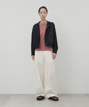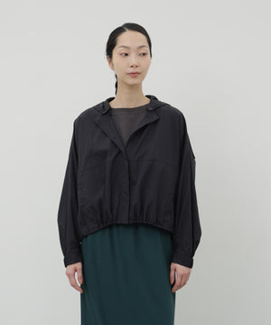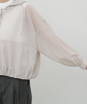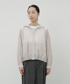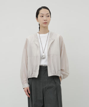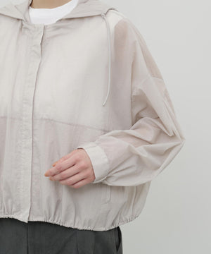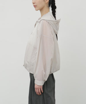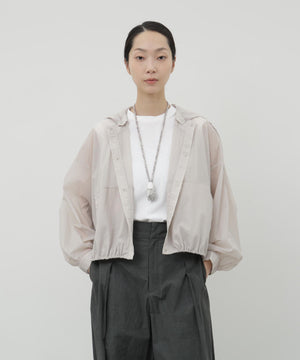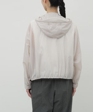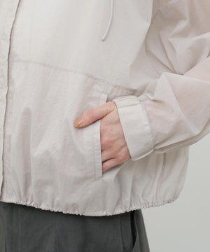 ふわりと風をはらむような、軽やかさが魅力のナイロンショートブルゾン。シアー感のあるエアリーな素材に初期撥水機能を備え、雨の日も晴れの日も快適に過ごせます。羽織るだけでスタイリングに抜け感が生まれ、軽量でストレスのない着心地は日常から旅先まで幅広いシーンで活躍します。畳めばコンパクトになり、バッグに忍ばせておきたくなる扱いやすさも魅力です。脇下にはハトメのホールを施し、風の通りをつくりました。取り外し可能なフードは、天候に応じて便利に着ていただけます。