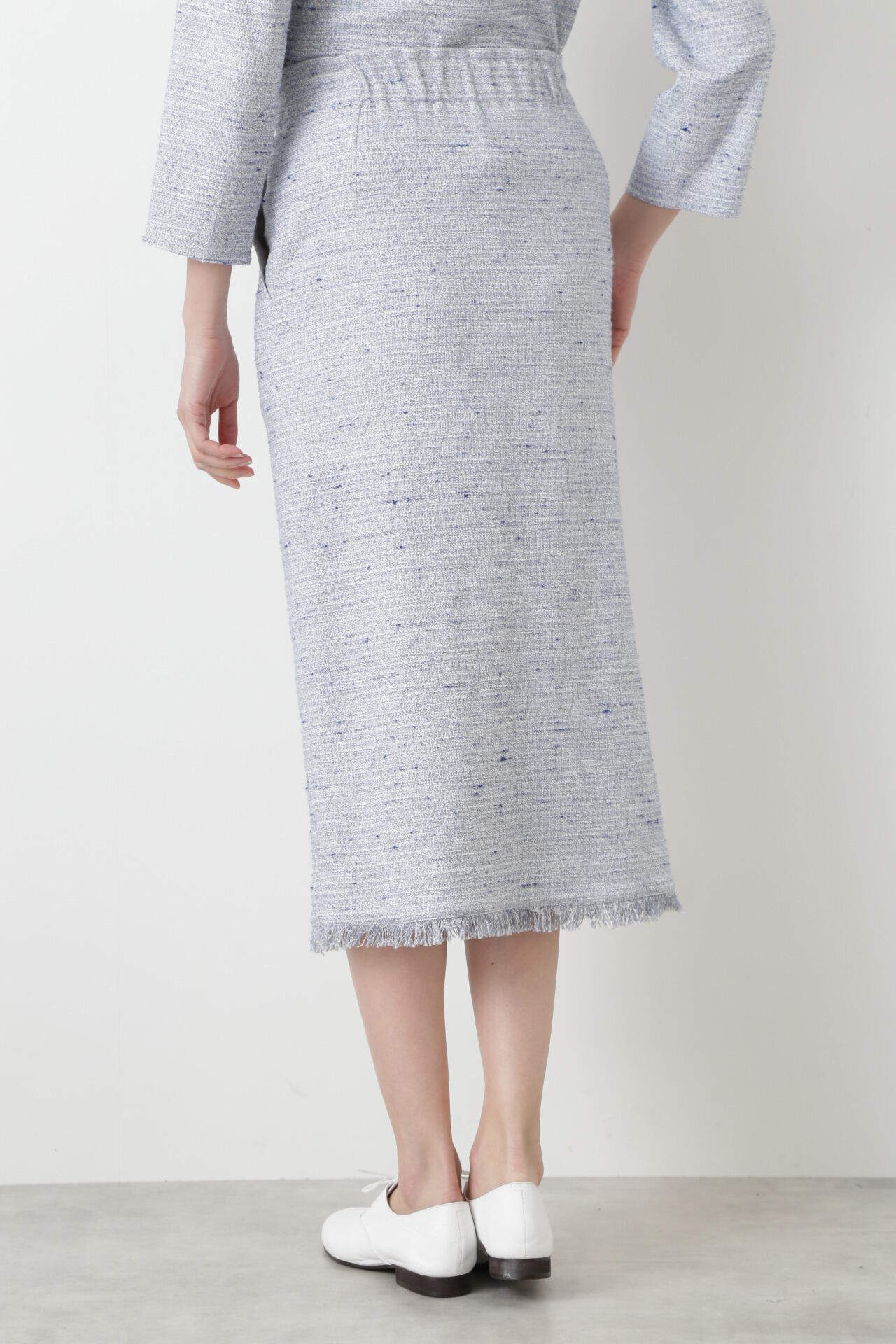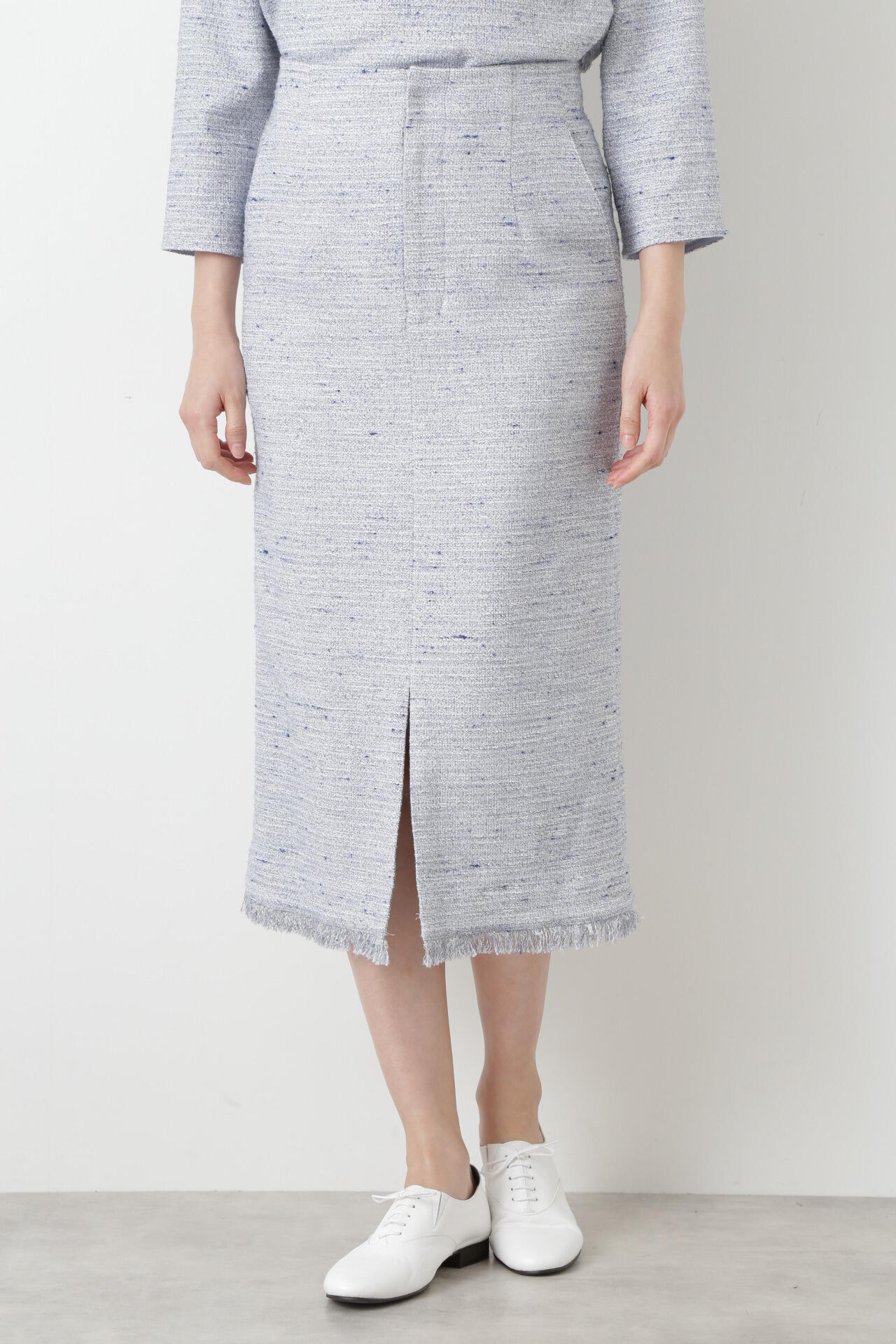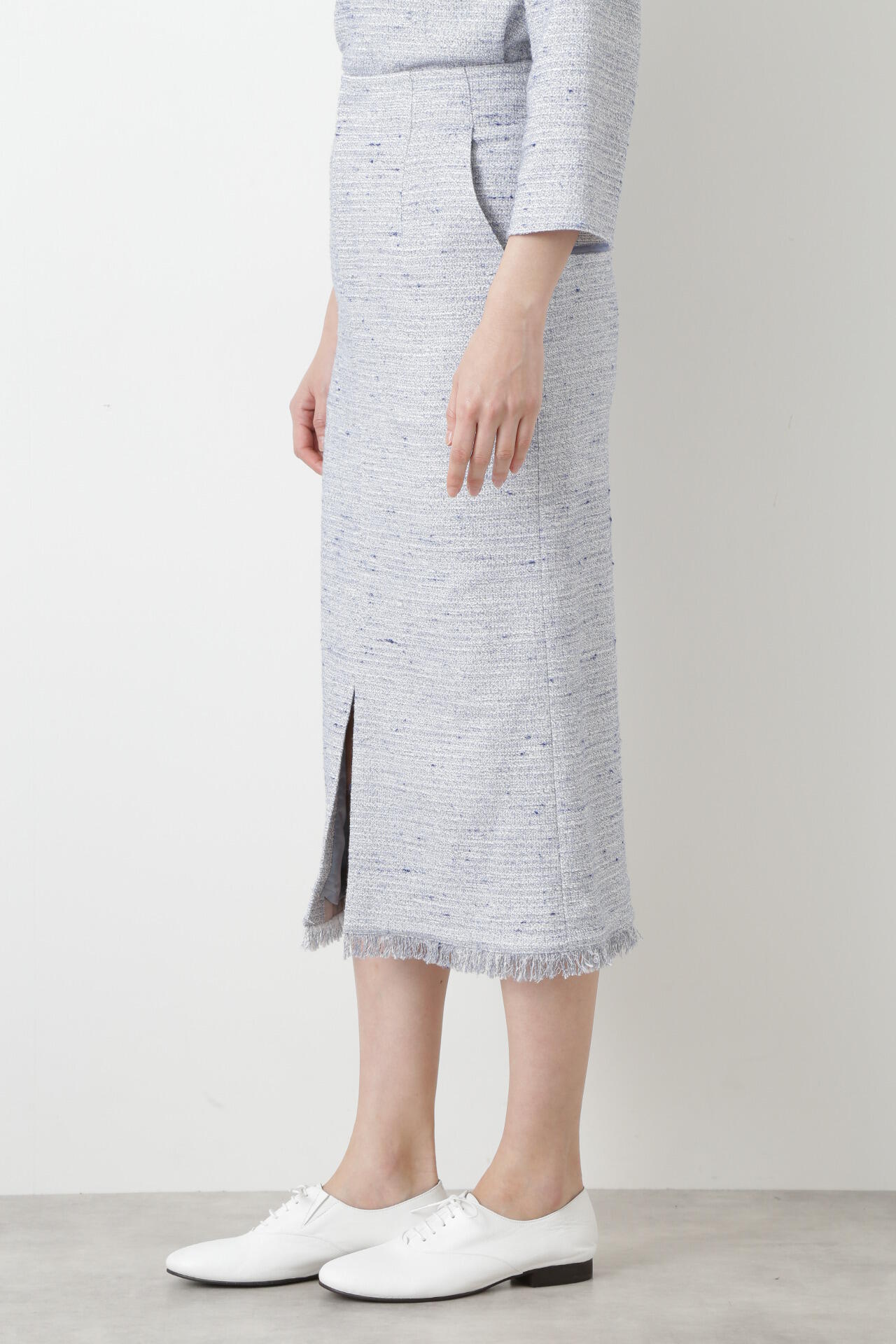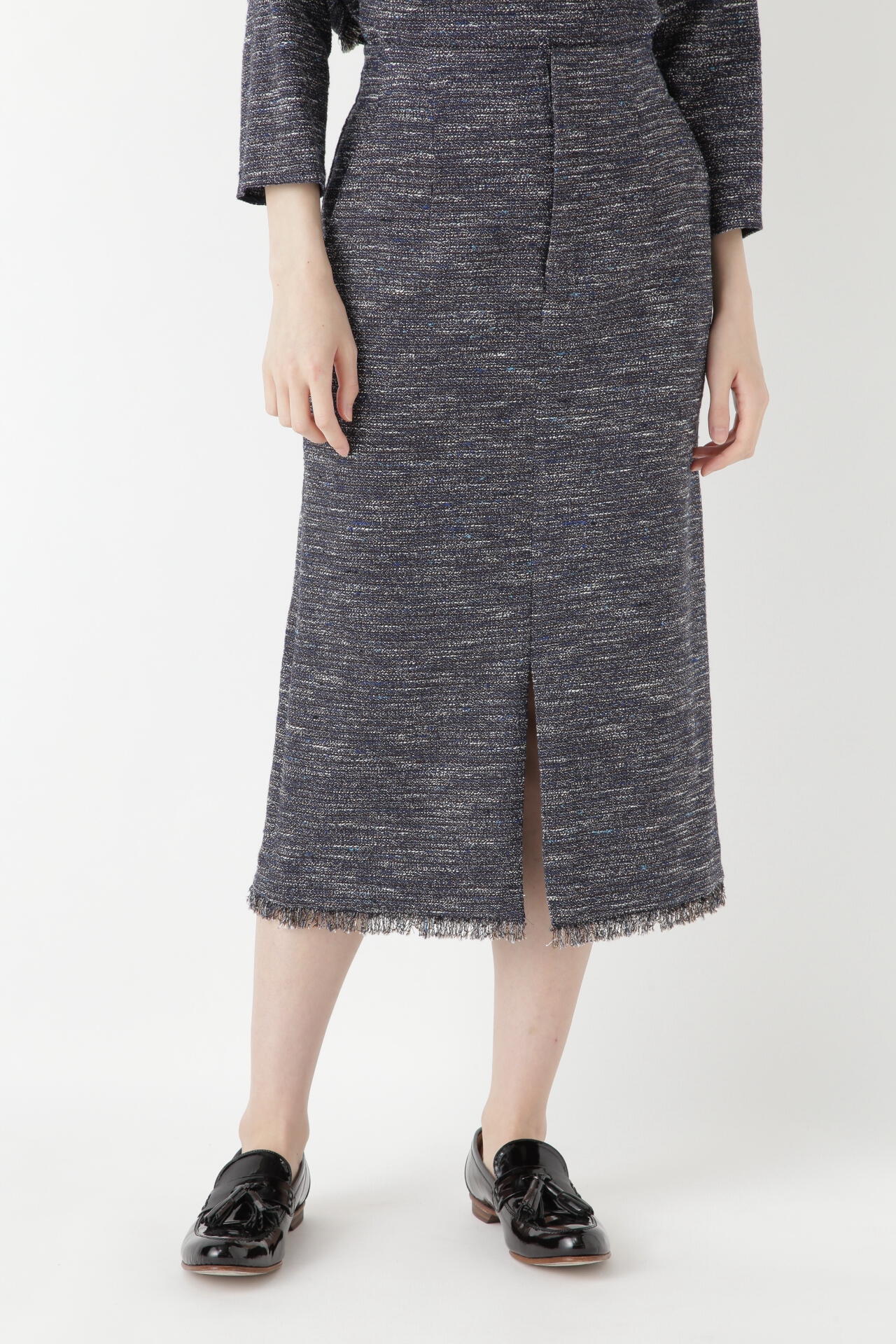 イタリア製のスラブサマーツイードを使用した、続きベルトのハイウエストタイトスカートです。裾に施した、インポートらしいニャンスカラーの混ざったフリンジ使いがポイントです。差し色の混ざったブルーとネイビー2色展開で、ボーダーカットソーなどあえてカジュアルアイテムと合わせて着崩したスタイリングがおすすめです。
