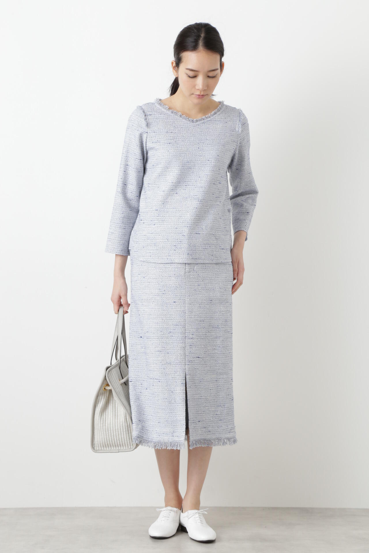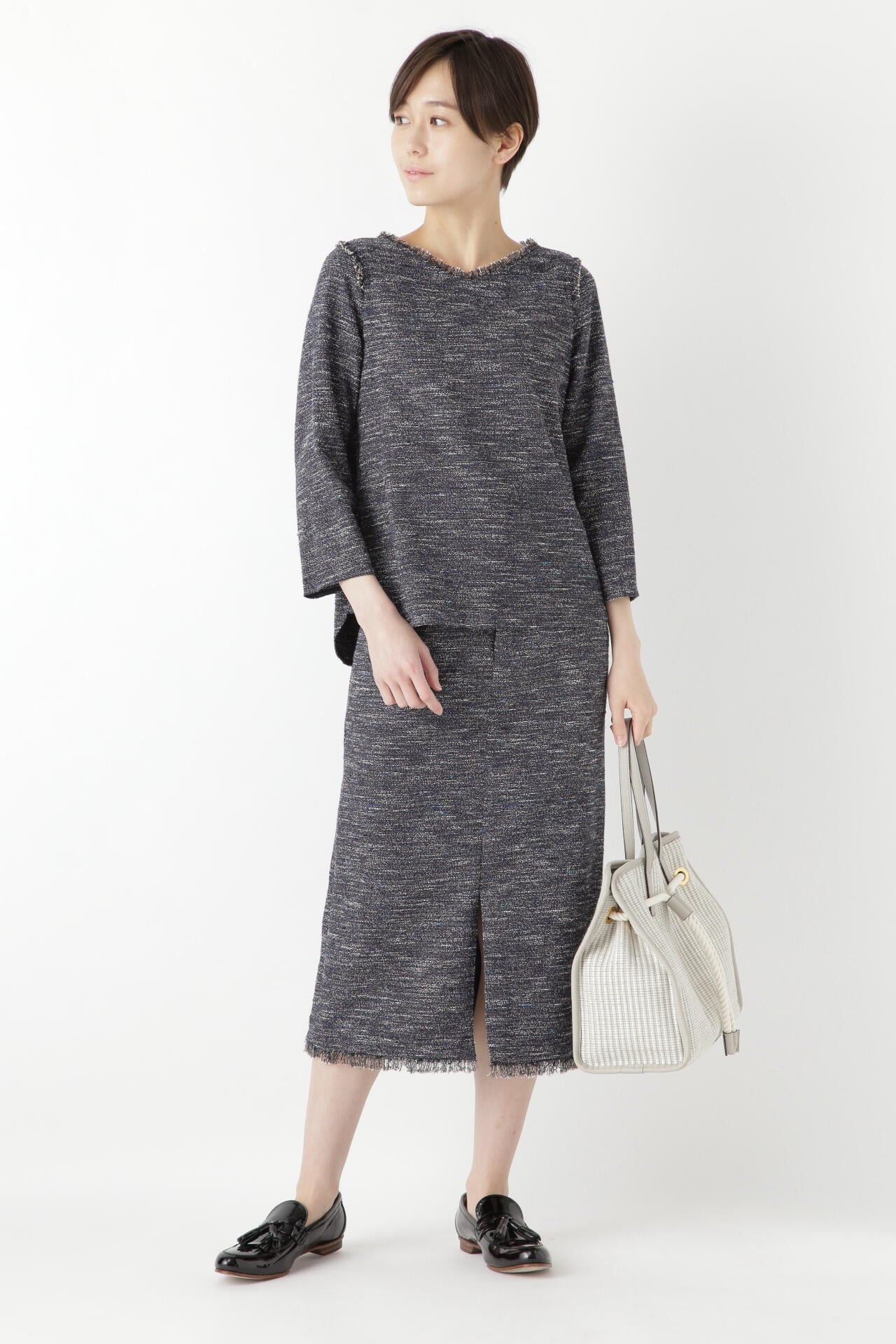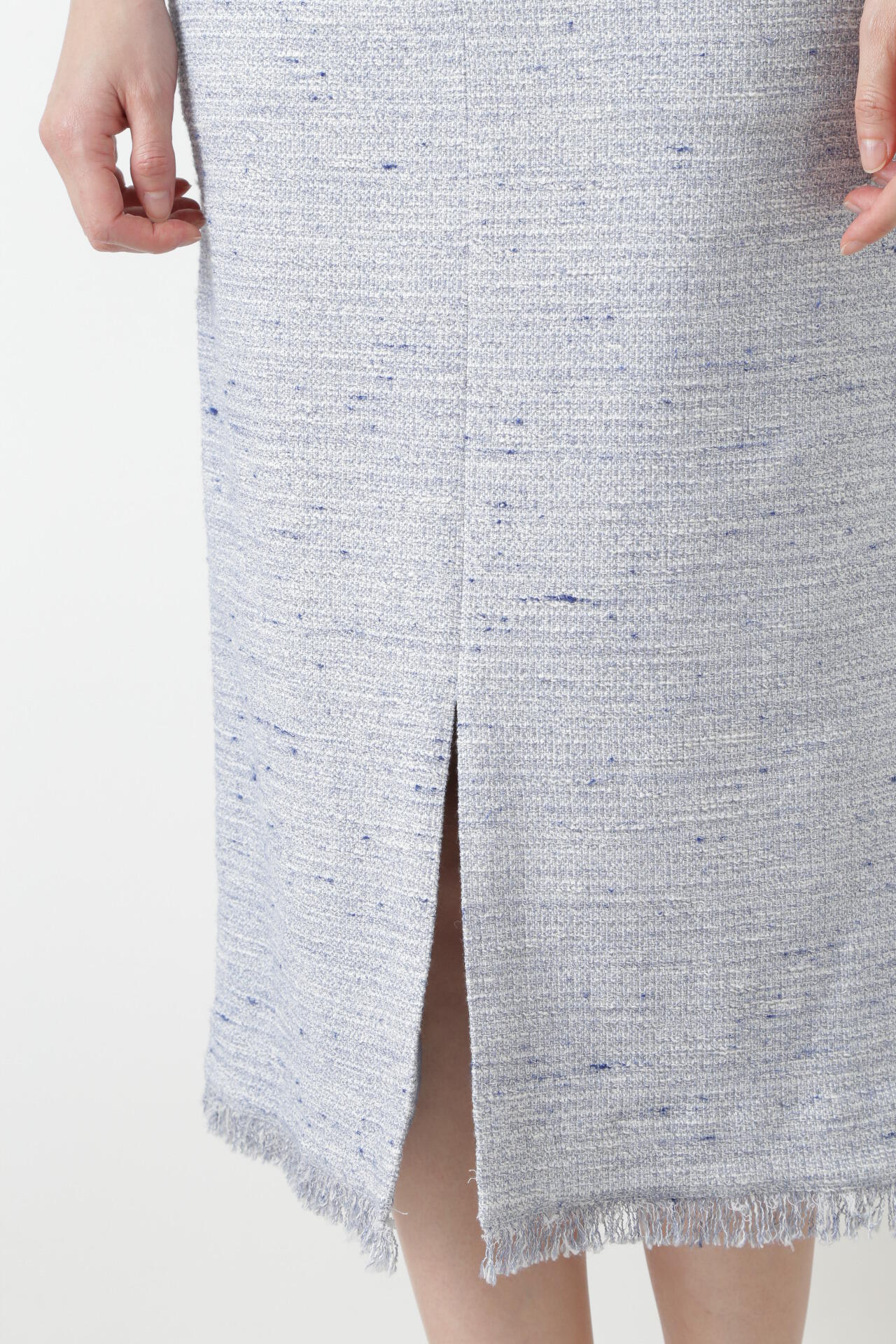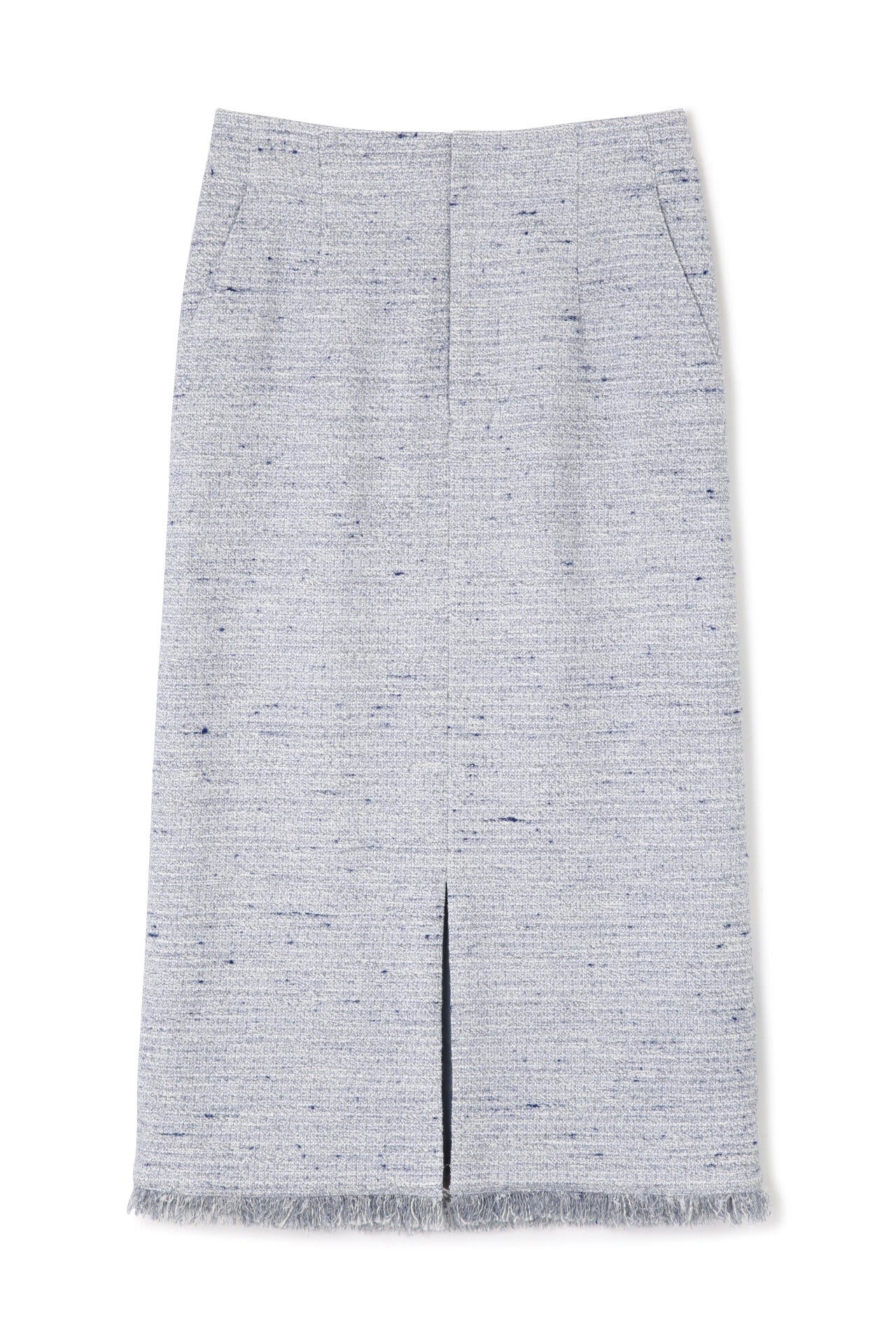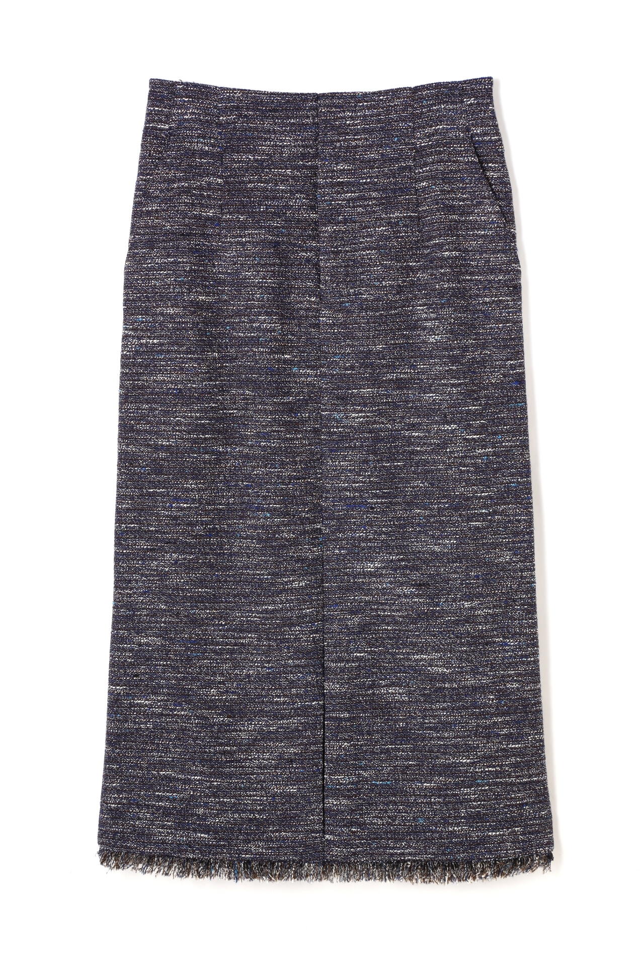 イタリア製のスラブサマーツイードを使用した、続きベルトのハイウエストタイトスカートです。裾に施した、インポートらしいニャンスカラーの混ざったフリンジ使いがポイントです。差し色の混ざったブルーとネイビー2色展開で、ボーダーカットソーなどあえてカジュアルアイテムと合わせて着崩したスタイリングがおすすめです。