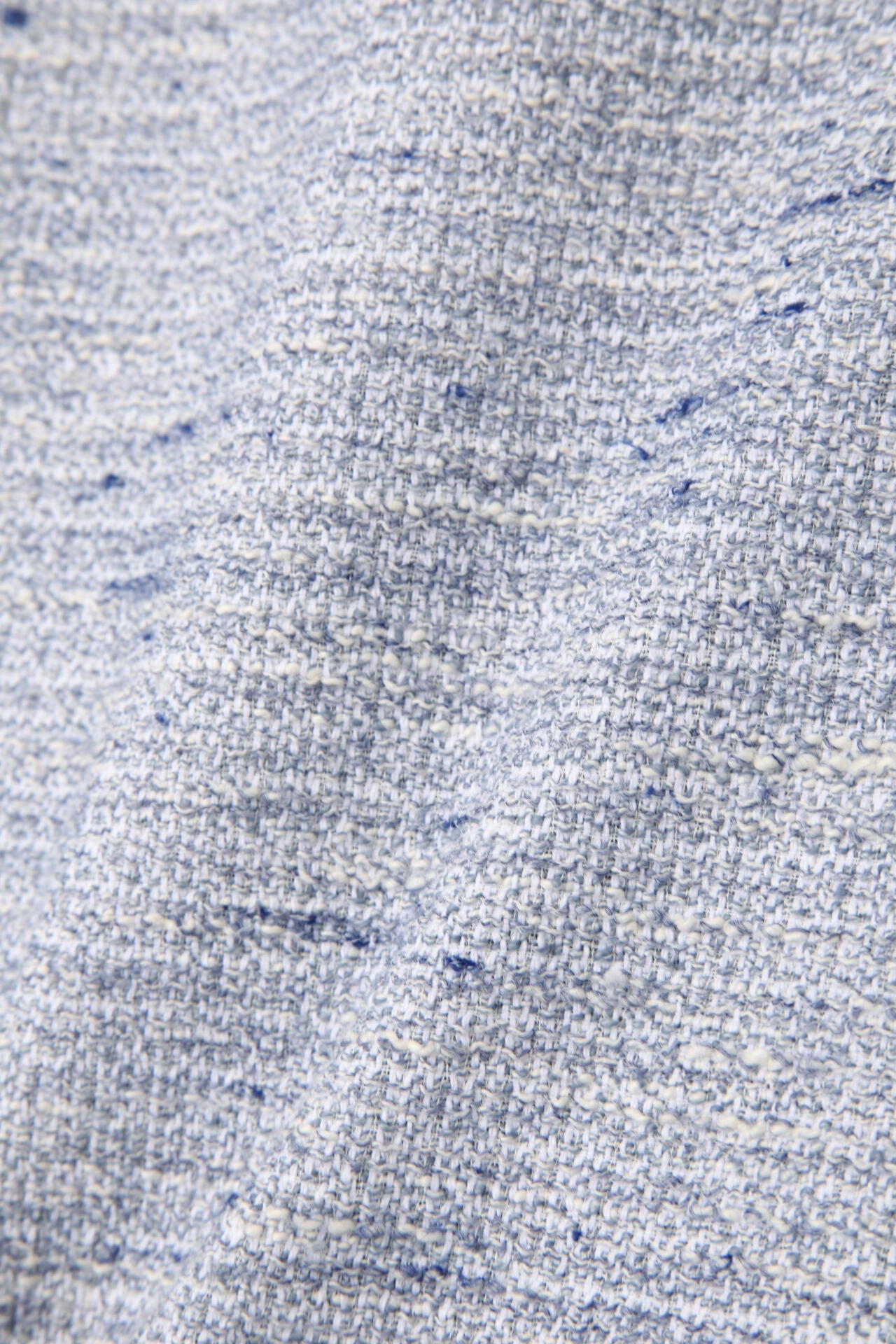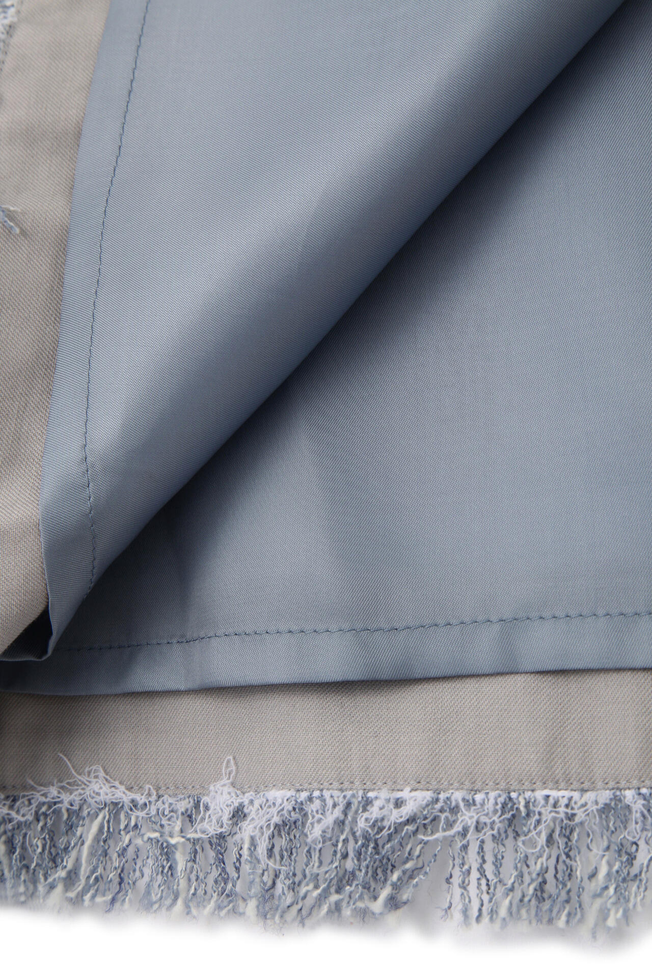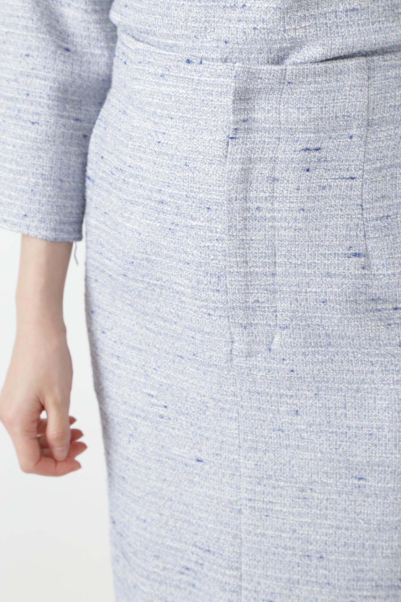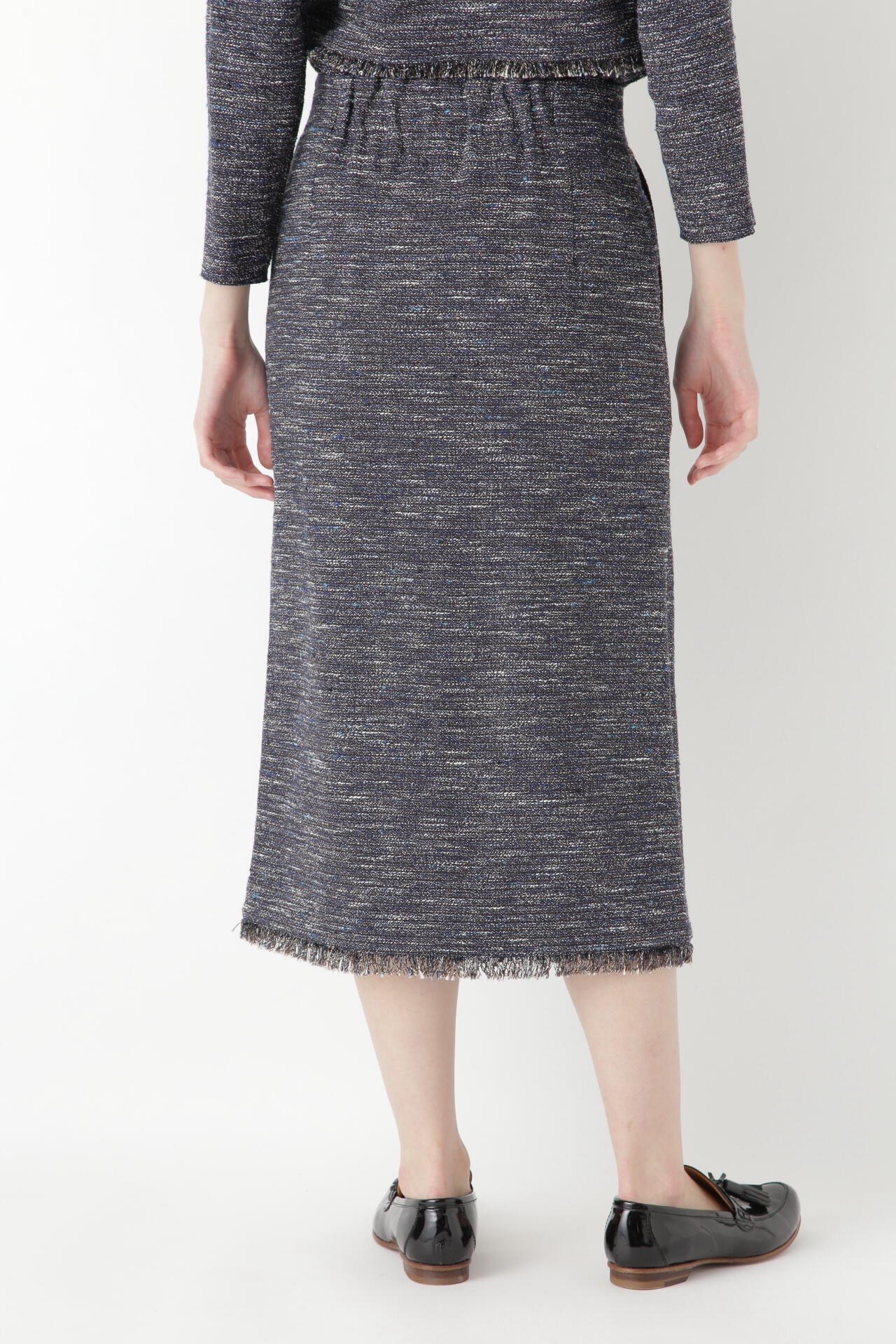 イタリア製のスラブサマーツイードを使用した、続きベルトのハイウエストタイトスカートです。裾に施した、インポートらしいニャンスカラーの混ざったフリンジ使いがポイントです。差し色の混ざったブルーとネイビー2色展開で、ボーダーカットソーなどあえてカジュアルアイテムと合わせて着崩したスタイリングがおすすめです。