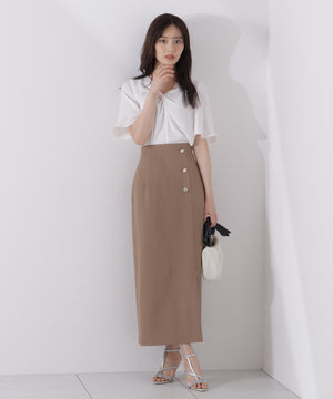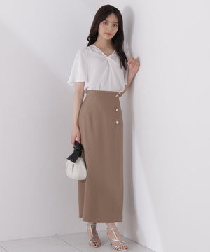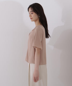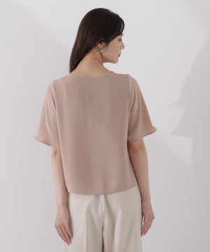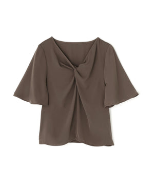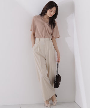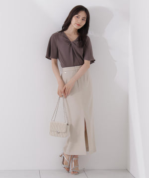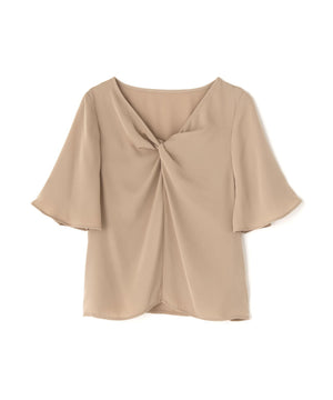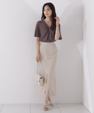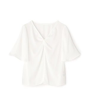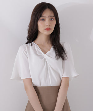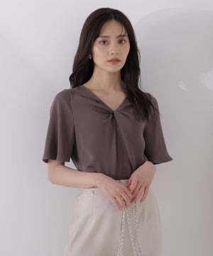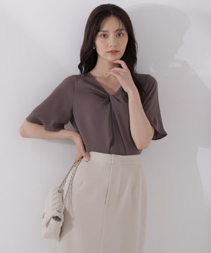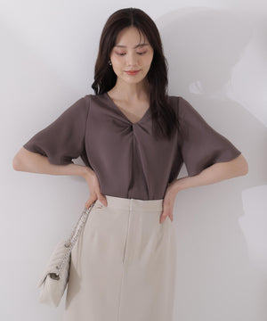 胸元にツイストを効かせた大人フェミニンなブラウスです。ねじりを加えたツイストデザインで立体感を出しながら、襟は幅広Vネックで顔まわりをすっきりと見せてくれます。シワになりにくく柔らかいタッチの生地を使用しており、デイリーに着用いただけます。