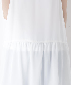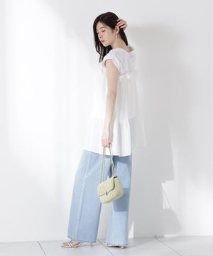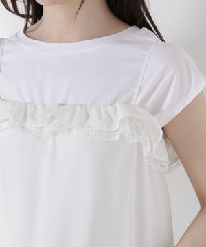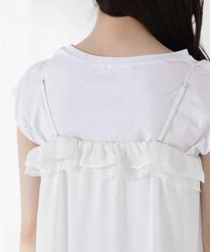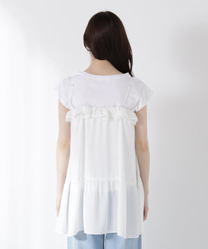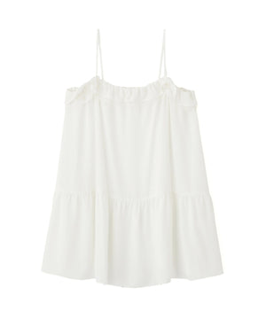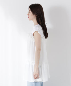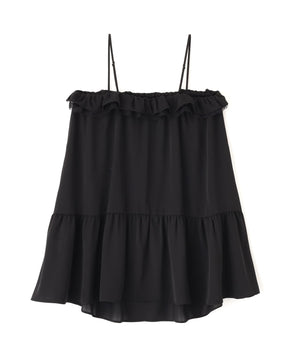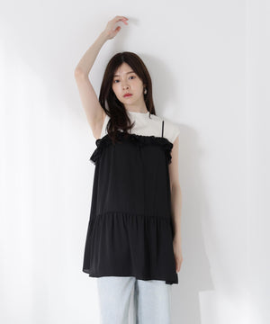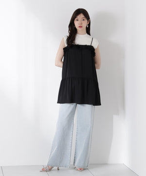 胸元でレースとデシン素材を重ねたラッフルがオトナ可愛いキャミチュニックです。Tシャツやカットソーの上からレイヤードすると、程よいフェミニンさを演出。パンツを合わせたコーディネートがお勧めです。