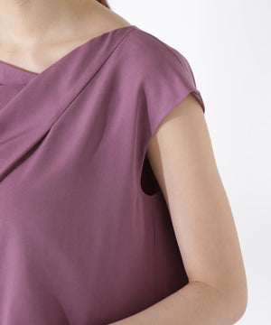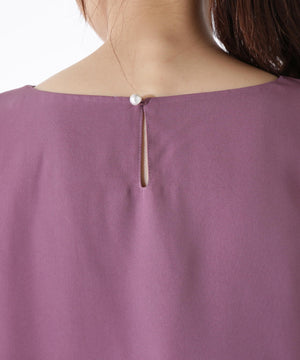 デコルテラインが綺麗に見えるアシンメトリーなタックを入れた大人ブラウスです。程よく二の腕をカバーするフレンチスリーブの袖丈が嬉しいポイント。後ろネックはパール調ボタン付き。裏地付きのシフォン素材なので安心して着ていただけます。