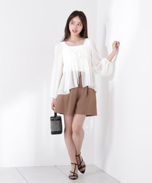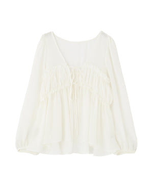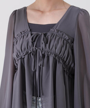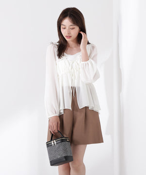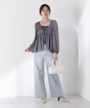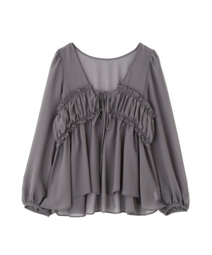 軽いシフォン素材を使ったブラウスです。ボリュームのあるスリーブがオトナ可愛いポイント。前リボンとギャザーディテールがアクセントになり、カーディガンのような感覚でさらりと着られます。透け感ある素材なのでインナーにキャミソールやタンクトップ合わせがお勧めです。
