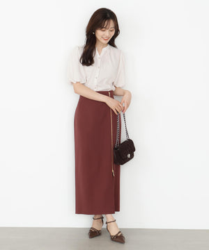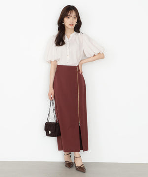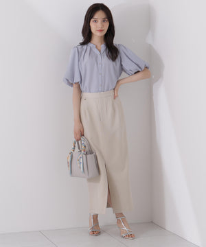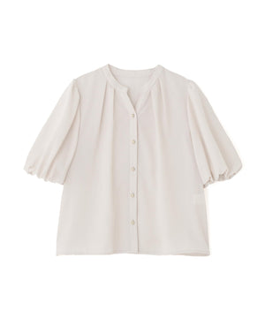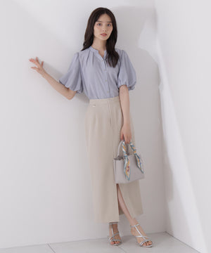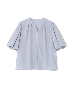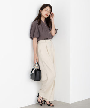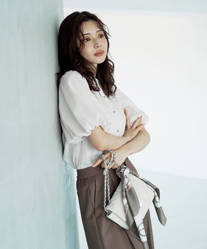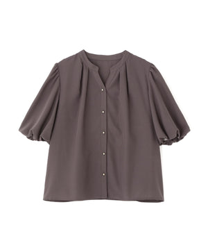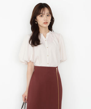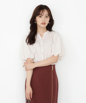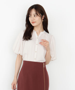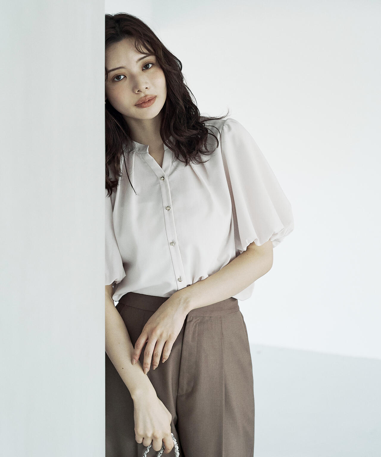 襟ぐりにタックをあしらったキレイめブラウスです。フロントのきらっとボタンがポイント。袖はバルーンスリーブなので、気になる二の腕をカバーしながら、オトナ可愛い印象で着ていただけます。